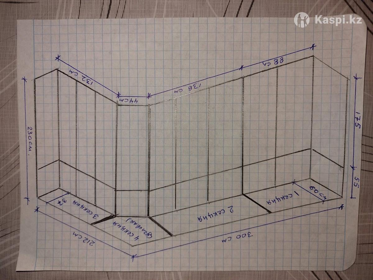 Продам набор шкафов с антресолью. Состоит из 4х секции . Размеры указаны в чертеже .2 и 4- я шкафы плательные .1 и 3- я полки . Светлая ЛДСП.Общая стоимость- 90 тыс.тенге. Можем продать по отдельности.