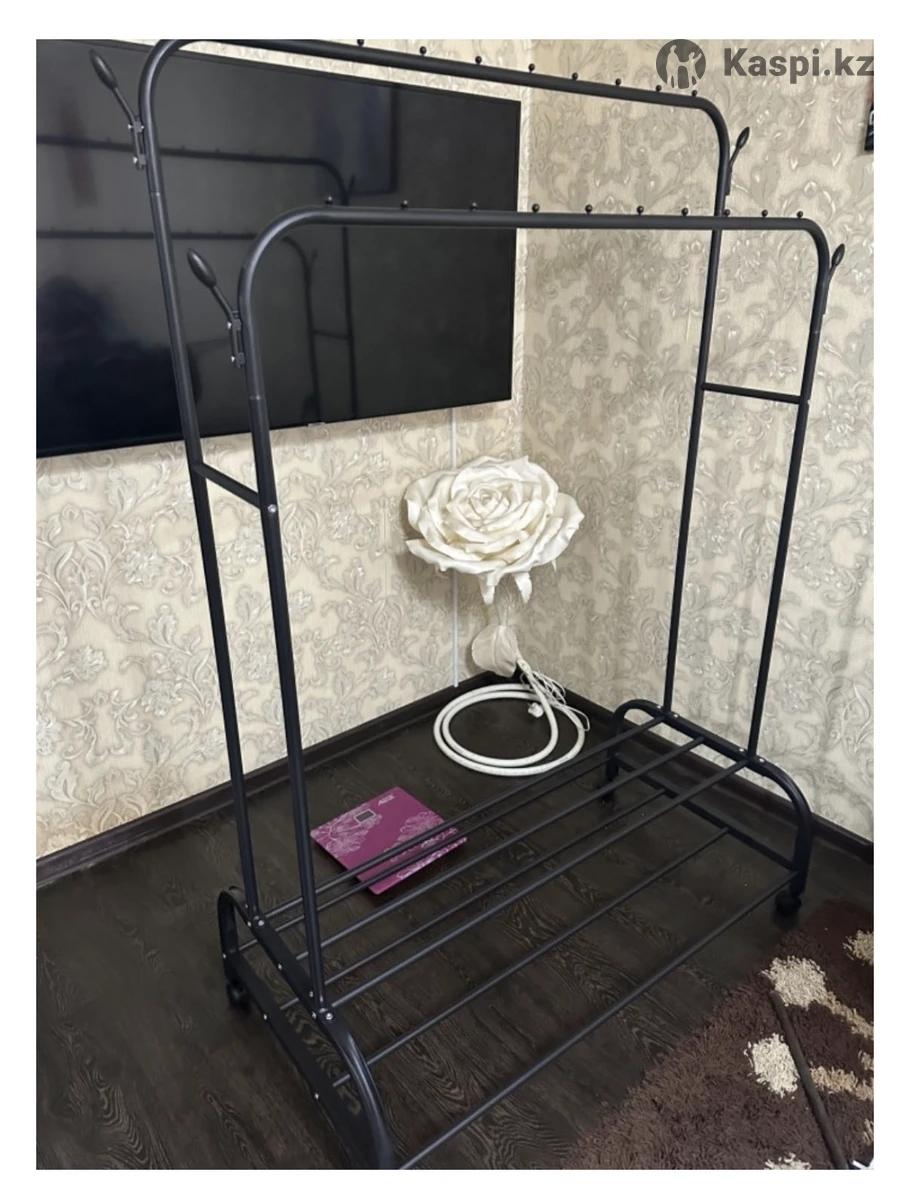 Срочно продам напольную вешалку Состояние: б/у, отличное. Материал – металл, очень прочная. Есть 2 перекладины для одежды, полка для обуви и 4 крючка. Удобная, устойчивая, на колесиках — легко перемещается. Размеры: ширина 108 см, глубина 40 см, высота 150 см. Цена: 5 000 тг (торг уместен) Тел.: — Даяна