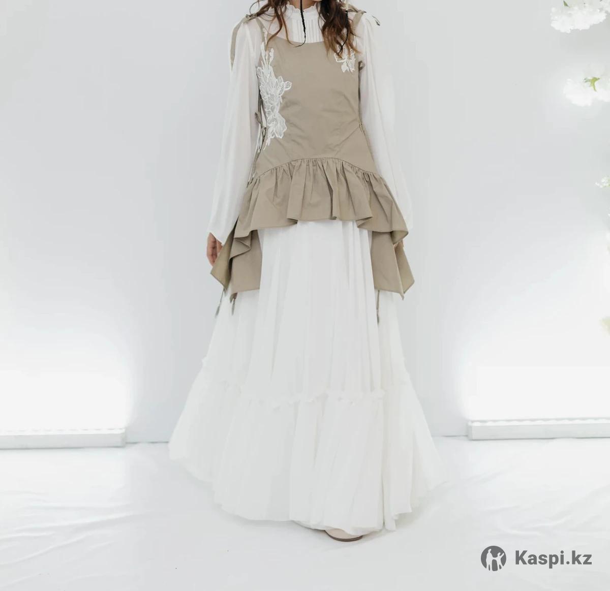 Платье для узату / сырға салу Нежное и утонченное платье, выполненное полностью вручную в ателье. Состоит из двух частей: 1.Белое длинное платье из легкой струящейся ткани. 2.Сверху — съемный корсет с декоративными элементами и кружевной вышивкой, который придает образу особую элегантность. Размер: 42–44 Ручная работа Шилось в ателье за 280 000 тг (вместе с тканью) Корсет снимается — платье можно носить и отдельно, как показано на втором фото. Надевала 1 раз , в идеальном состоянии Идеально подойдет для узату, сырға салу или других торжественных мероприятий. Смотрится очень изысканно и воздушно Реальному клиентку реальная скидка