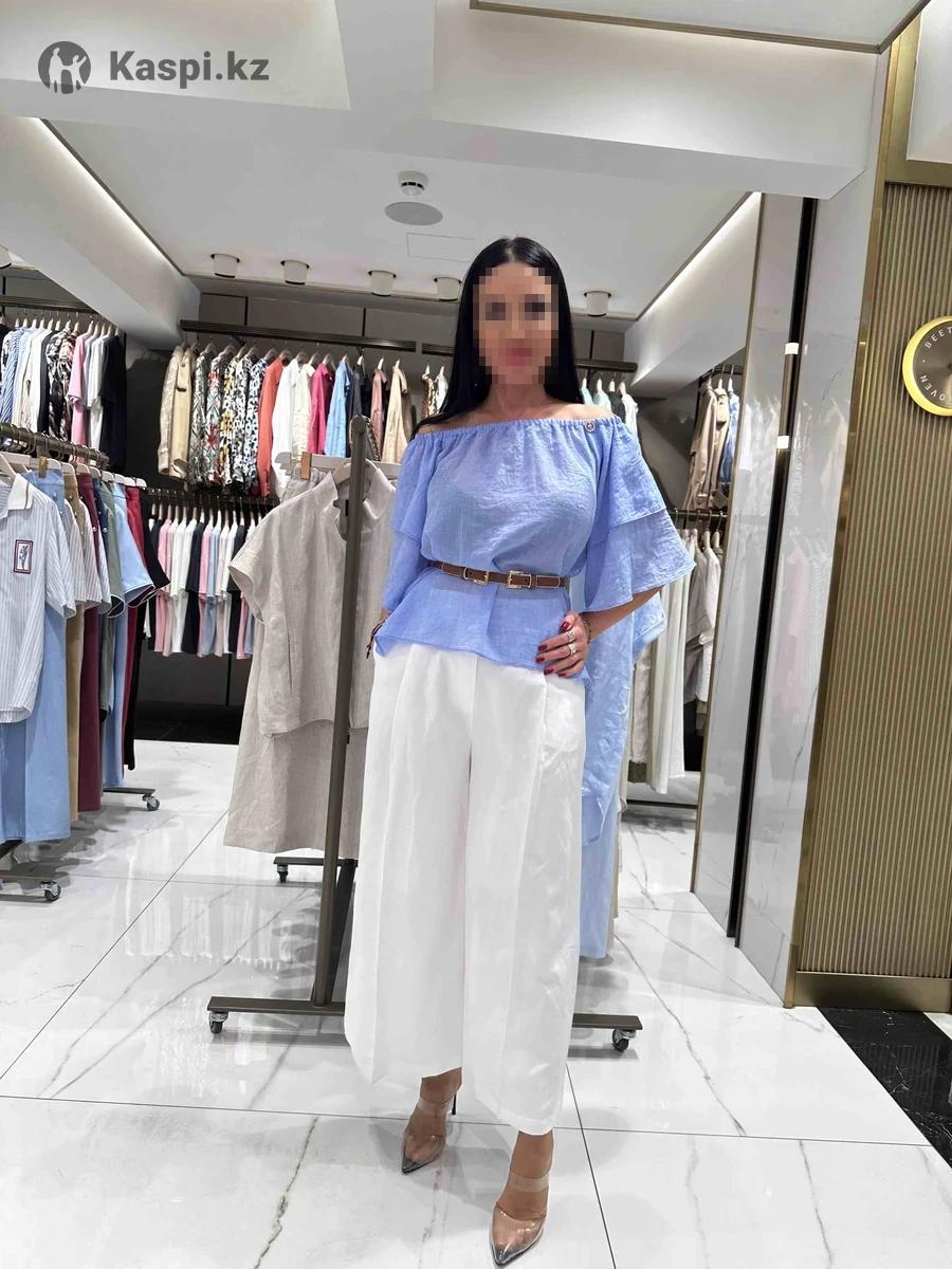 Продам стильную двоечку, ткань на брюках хлопок 100%, крестьяночка ткань марлевка, со стильным ремешком,очень нежное сочетание двух цветов, размер 42.44.46