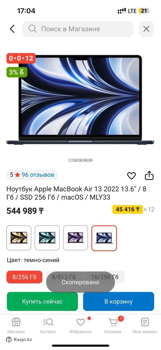 Продам Ноутбук Apple MacBook Air 13 2022 13.6" / 8 Гб / SSD 256 Гб / macOS / MLY33 в абсолютно новом состоянии г. Костанай. С момента покупки пользовались всего несколько раз. Хорошая цена, сделайте близкому человеку подарок на Новый год Сейчас на каспи он стоит минимум 540 тыс В подарок сумка для ноутбука