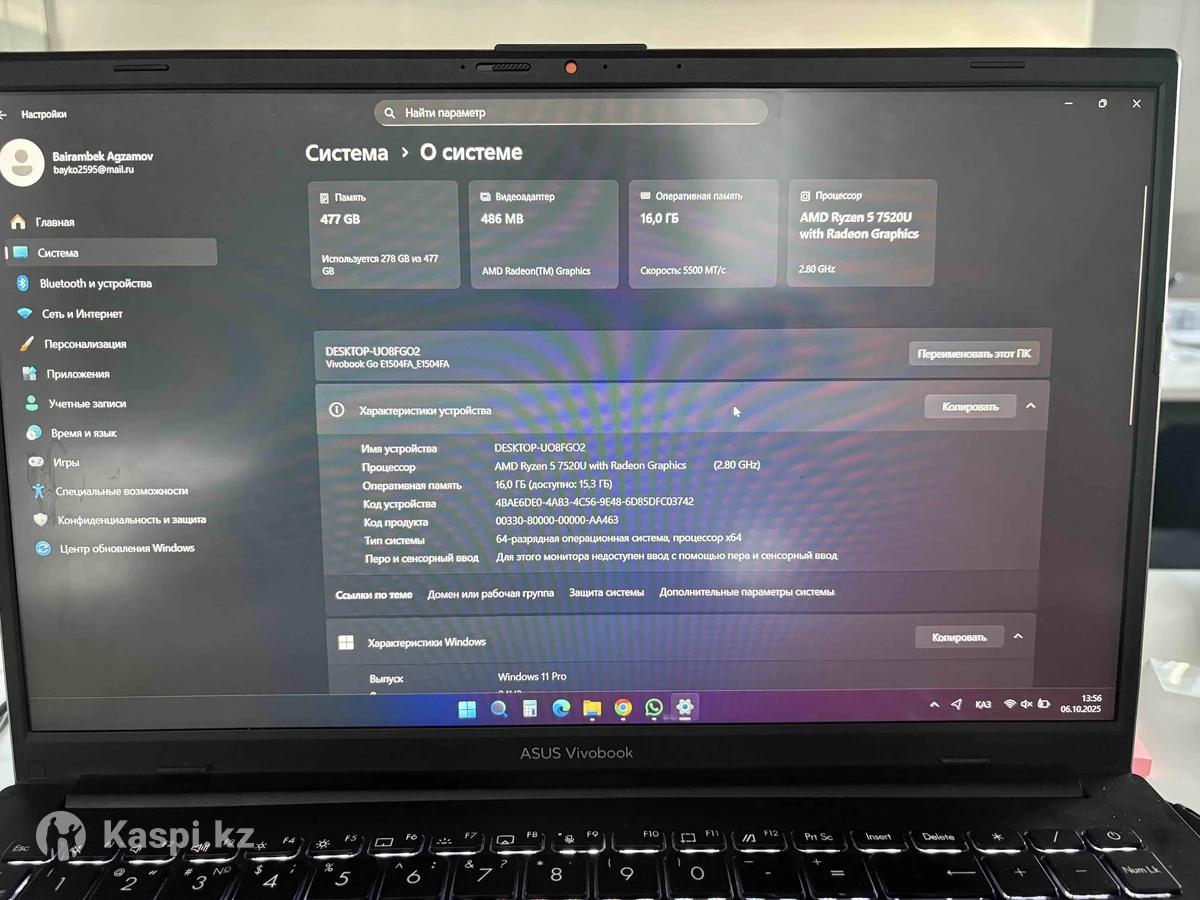 Куплено в Sulpake в январе 2025 в хорошем состоянии не измотана играми Память 477Гб Видеоадаптер 486МБ Оперативная память 16ГБ Процессор AMD Ryzen 5 7520U with radeon Graphics 64 разрядный Виндовс 11