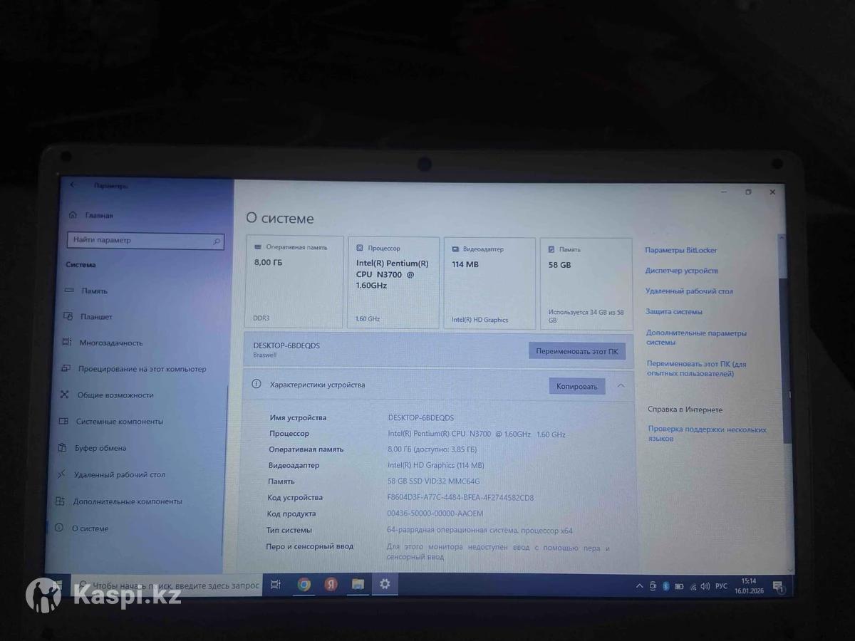 Продам Ноутбук в идеальном состоянии Процессор: Intel Celeron N3150, 4 ядра Память накопителя: 58 ГБ Оперативная память: 8 ГБ Экран: 14", HD WINDOWS 10 Подсветка клавиатуры нету блок питание шнур все есть мышка для работы имееться док коробка есть все чисто без минусов торг имееться