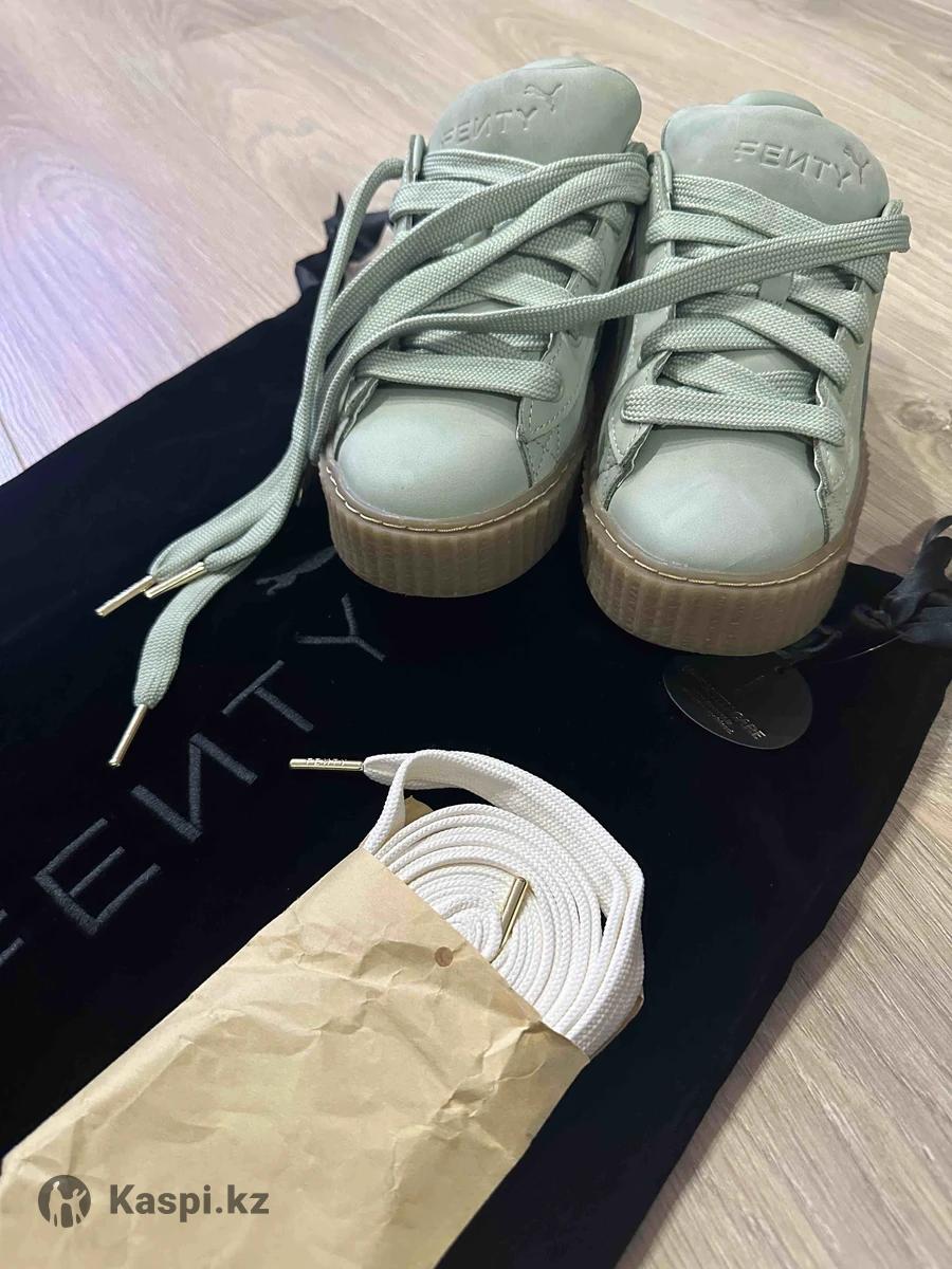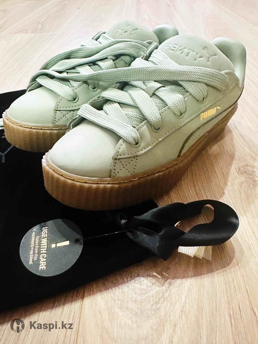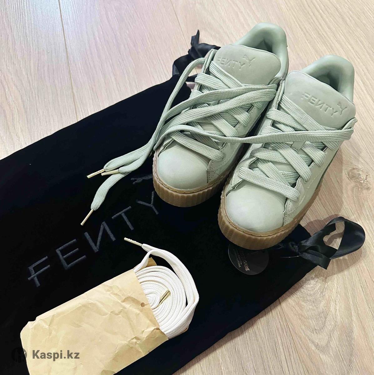 Новые Кроссовки Puma Fenty by Rihanna женские 38 размер, цвет: светло зеленый. Заказывала онлайн, не подошли по размеру. Покупала за 155$ В наборе дополнительные шнурки и брендированный бархатная сумка для хранения обуви. Бренд: Puma X Fenty ( коллекция коллаборация с Рианной ) Торг уместен
