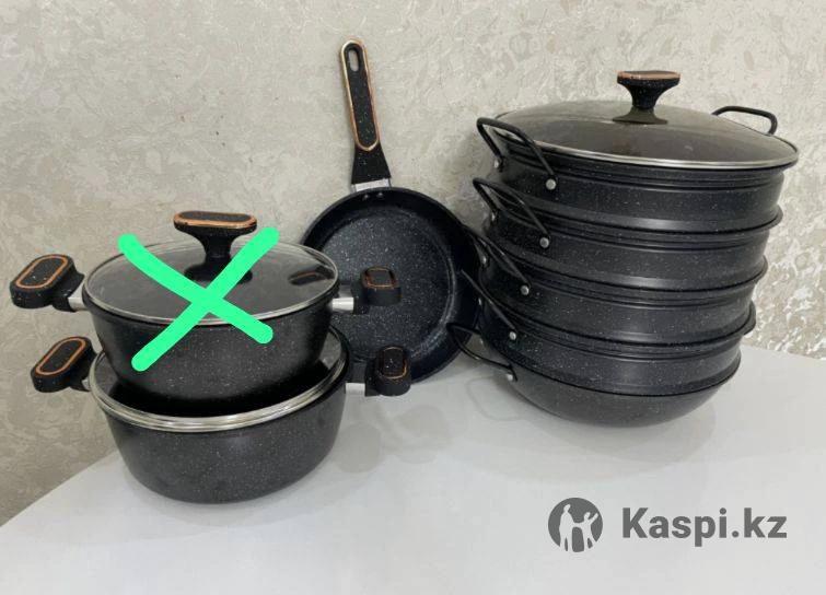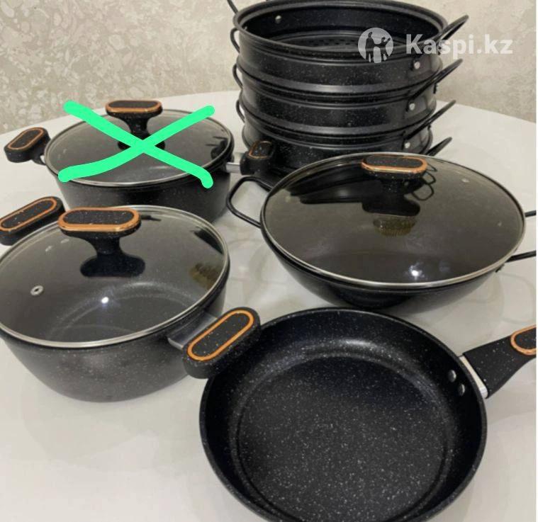 Продам набор казанова не дорого. 1)Казан 5л 30см 2) Казан 4л 24см 3) мантоварка 30см 4) сковородка 24 см. Причина продажи подарили. У меня уже есть такая мантоварка и казанки