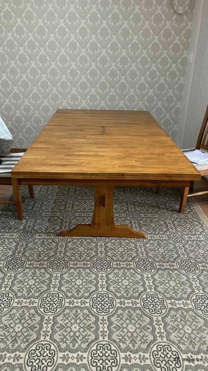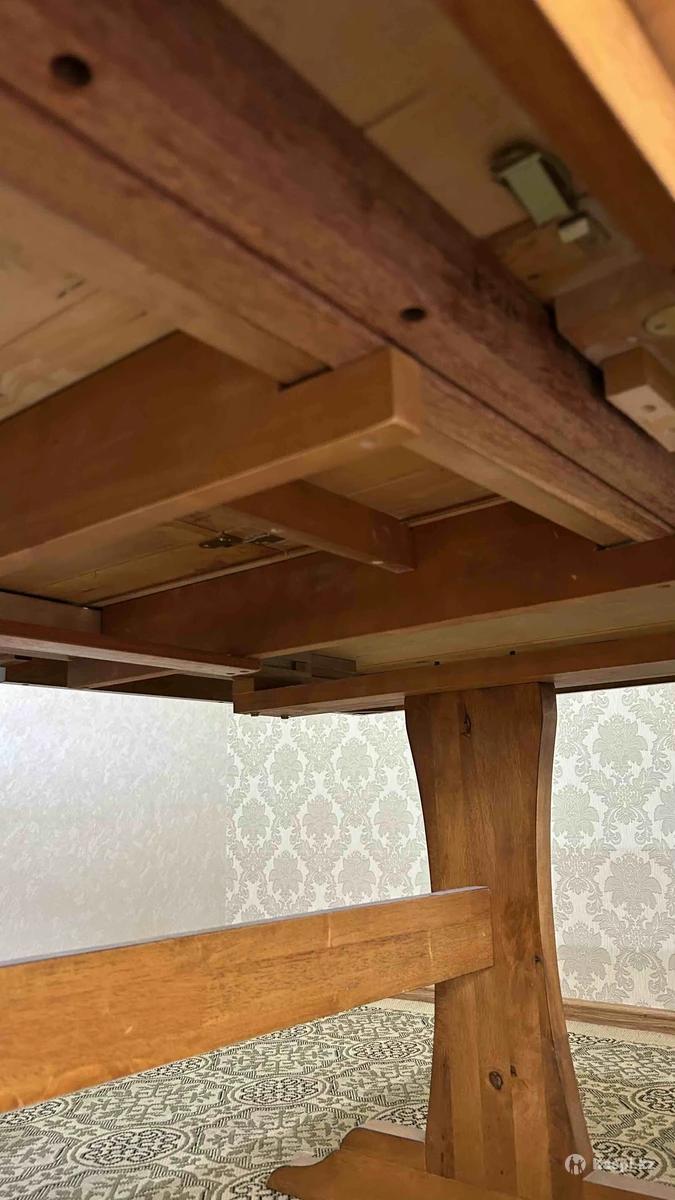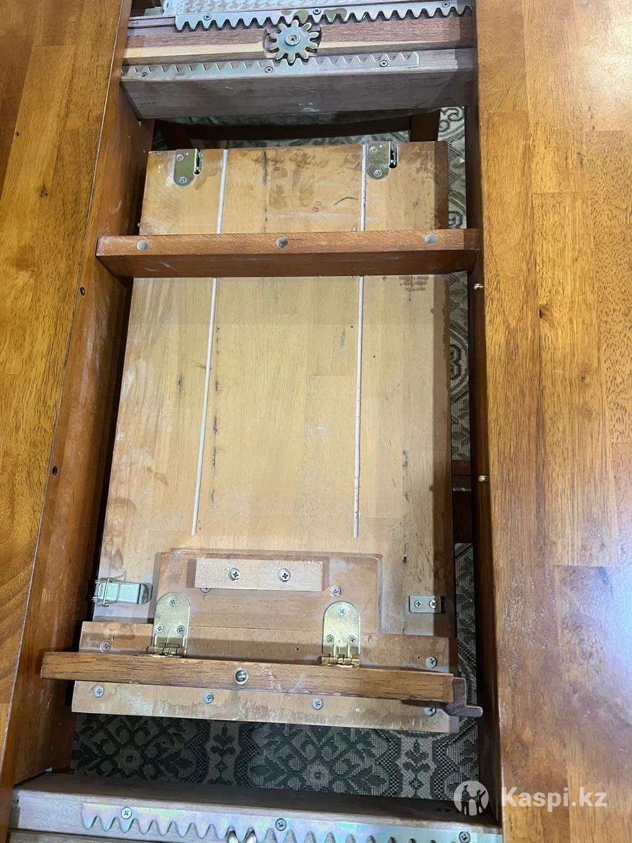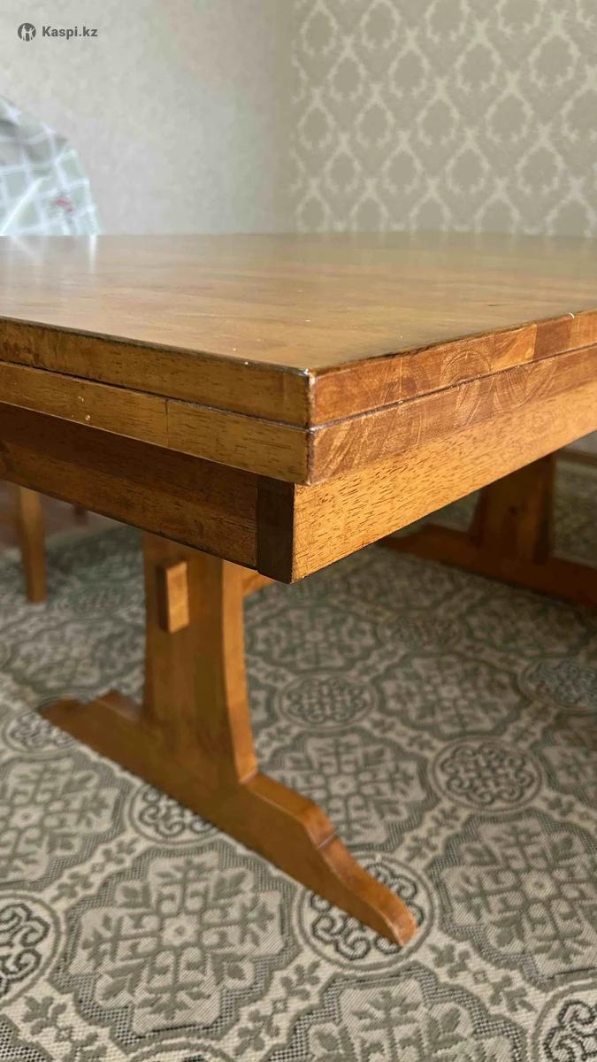 Продаю стол обеденный и 6 стульев. Все чистое дерево. Цвет ореховый. Отличного качества. Надежный, прочный, б/у в отличном состоянии. Размеры: длина 162 (192), ширина 106, высота 74. Два изножье, размещенные по центру стола. Стол прочный! Механизмы вечные. Прослужит не одно десятилетие. 6 стульев со деревянной спинкой, сиденье ткань. Цена 99 990тенге. Город Актау