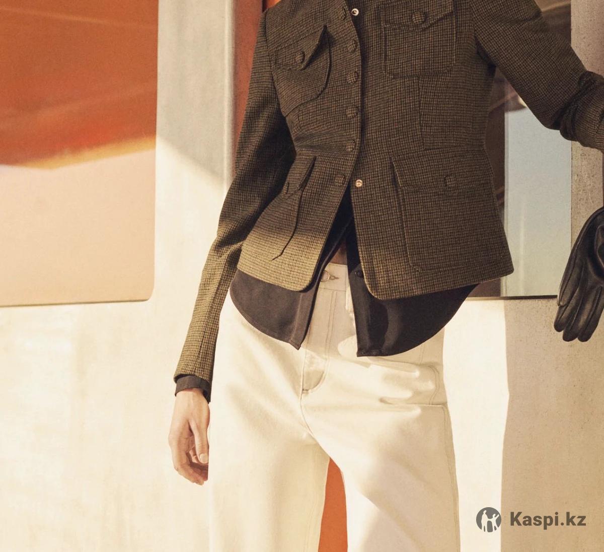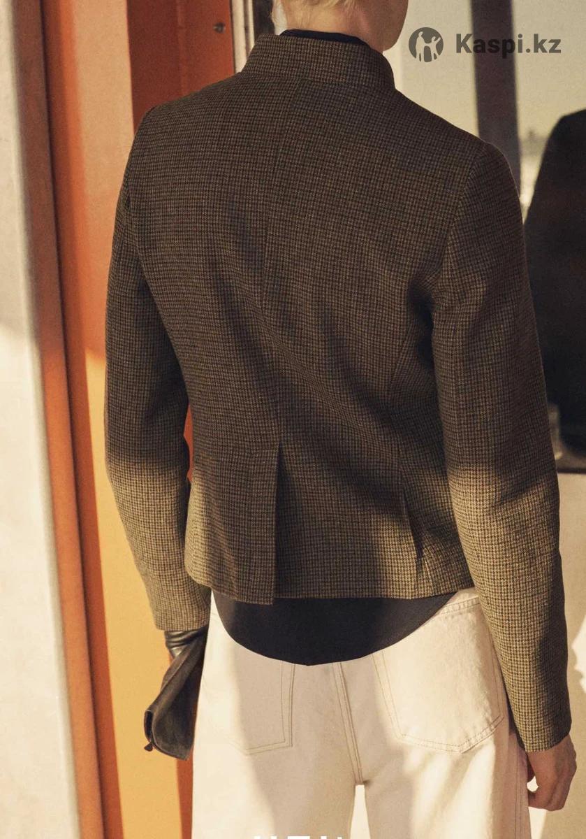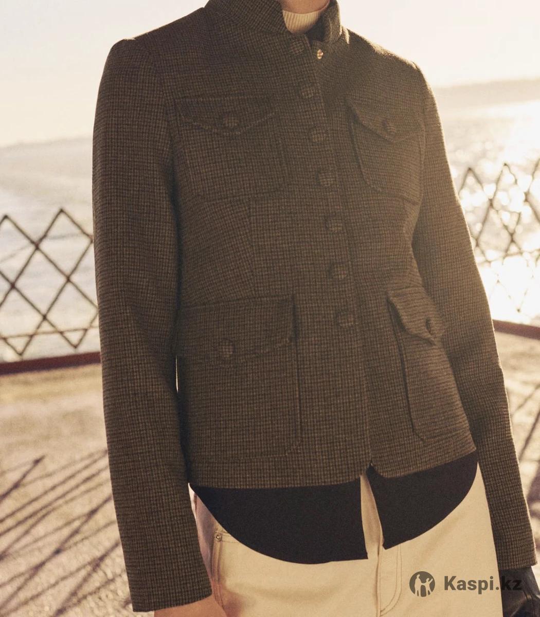 В состав входит шерсть. Прямой крой. Принт в мельчайшую куриную лапку. Воротник-ремешок. Длинные рукава. Спереди четыре кармана с клапанами. Застежка на пуговицы спереди. Подкладка. Total look. Дизайн в клетку размер м