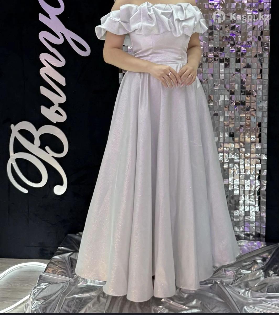 Роскошное вечернее платье нежного перламутрового оттенка с эффектным блеском. При освещении и на вспышке ткань красиво переливается, за счёт чего платье выглядит особенно нарядно и дорого на фото и видео. Фасон с открытыми плечами и объемными рюшами по линии груди. Юбка длинная, расклешённая, из легкой блестящей ткани. Идеально подойдёт для выпускного, свадьбы, торжества, вечеринки или фотосессии. Надевалось всего 1 раз, состояние отличное — без пятен и дефектов. Размер:42-44 Рост:на фото с каблуком 165см Состояние: как новое Причина продажи: не ношу Купила за 60тыс продам за 45тыс В рудном и в костанай