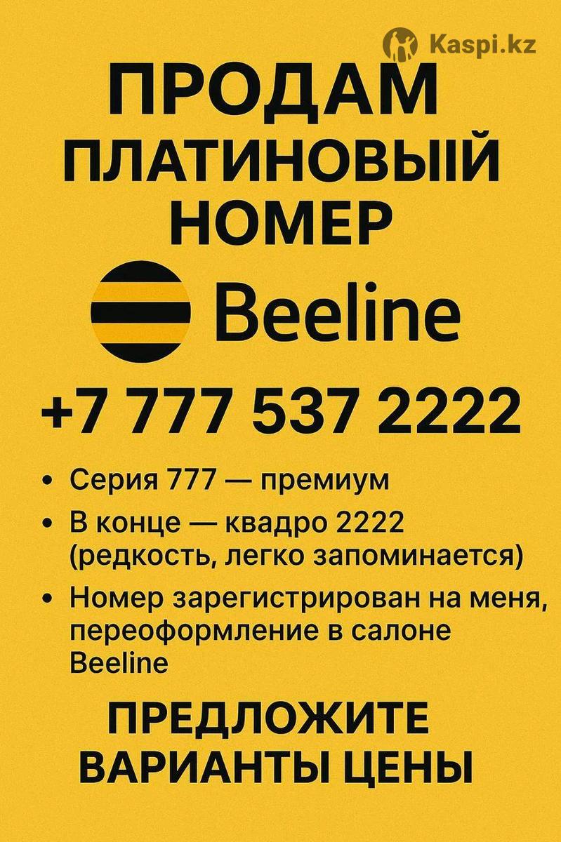 Продам ПЛАТИНОВЫЙ номер Beeline 📞 +7777 537 2222 Идеален для бизнеса или личного пользования — легко запоминается и выглядит статусно. Без долгов, переоформление официально в офисе Beeline. 📍 Астана По всем вопросам писать