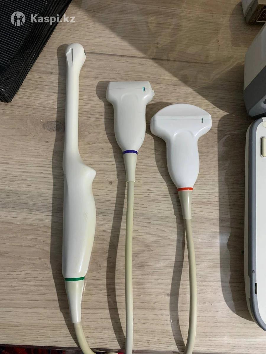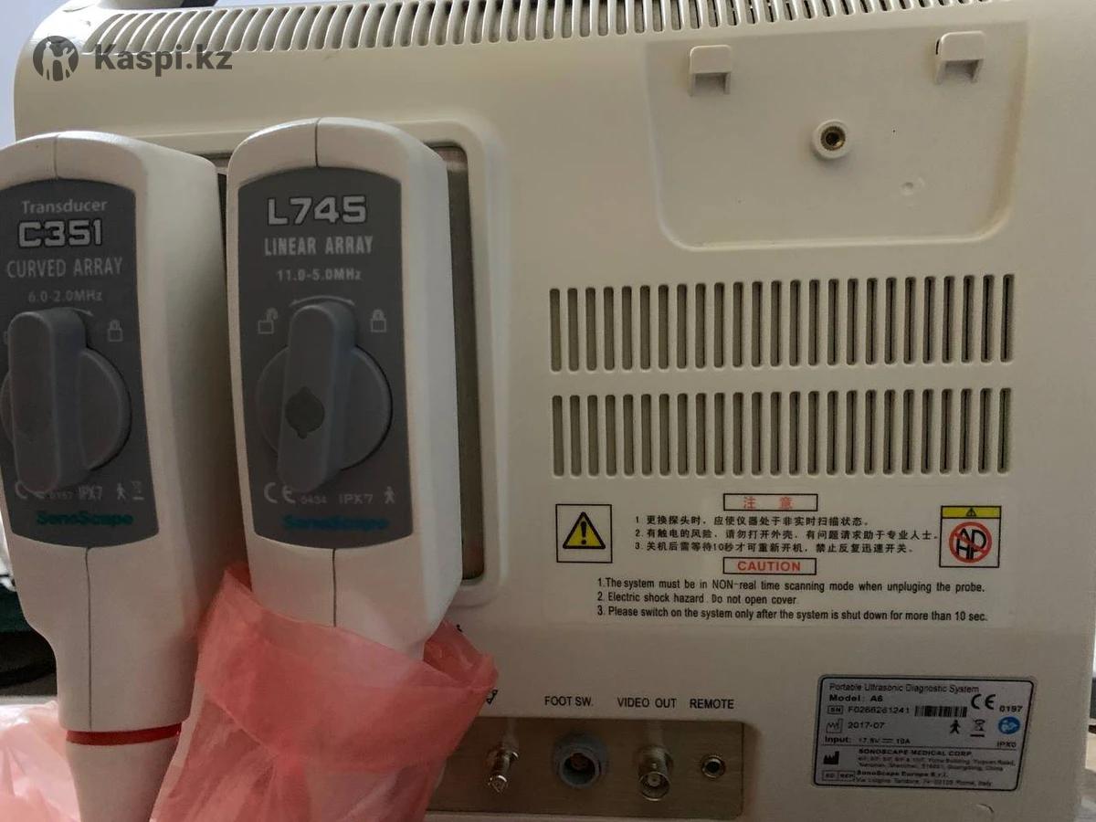 Портативный УЗИ-аппарат Sonoscape A6 В комплекте 3 датчика: C351 конвексный датчик, 6V4 эндовагинальный датчик, L745 линейный датчик. Состояние отличное, использовался аккуратно и бережно одним доктором. Аппарат прошел предпродажный осмотр специалистом медицинского сервиса и был оценен как находящийся в очень хорошем состоянии. Технические характеристики: Кинопетля на 512 кадров Расчеты для акушерства, гинекологии, кардиологии, ангиологии, урологии, ортопедии Составление и экспорт отчетов Входы/выходы для подключения персонального компьютера (LAN), видеорекордера и видеопринтера, запись на USB 2.0 флеш-карту, возможность внешнего DVD-RW Большой ЖК-монитор с диагональю 12” Разрешение монитора: 2 активных порта для подключения датчиков Диапазон рабочих частот: 2–13 МГц Встроенная батарея Возможность одновременного использования до 4 фокусных зон