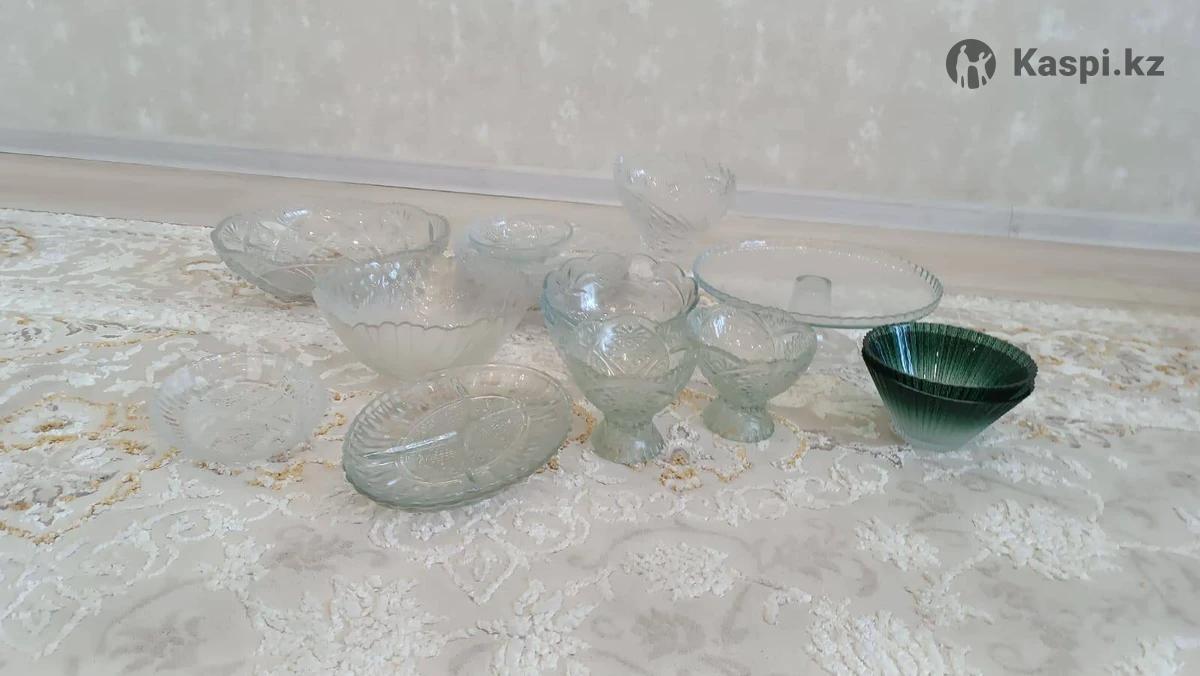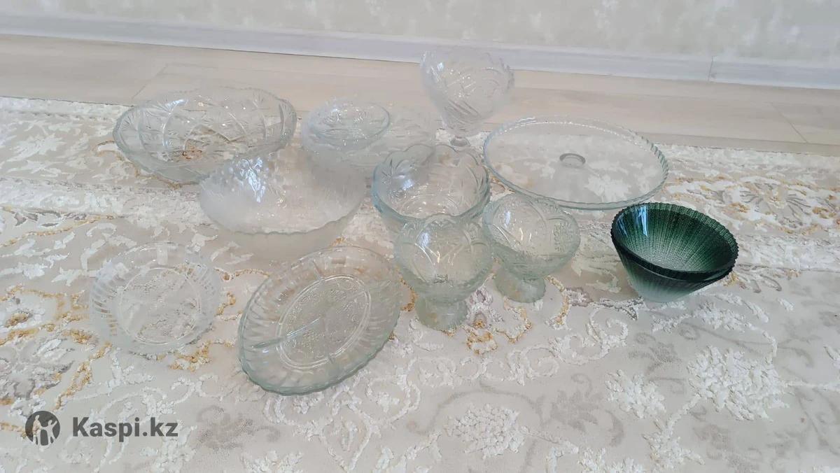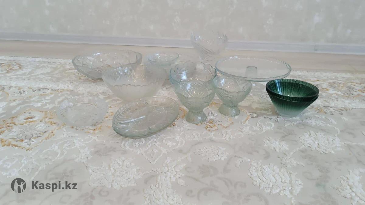 Продам все что на фото: тортница, фруктовница, вазы, грешницы,салатники, ещё есть 6 стаканов. За все 5000 тенге