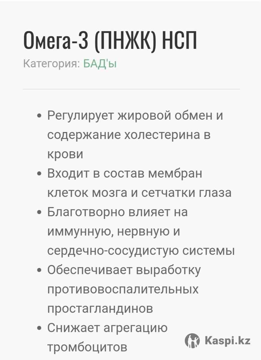Омега-3 ПНЖК снижают содержание в крови холестерина и триглицеридов, нормализуют артериальное давление и являются профилактическим средством при сердечно-сосудистых заболеваниях, предупреждают развитие тромбоза. Замедляют развитие опухолей и являются эффективным средством для профилактики онкологических заболеваний. Отмечен положительный эффект Омега-3 при лечении кожных заболеваний. Уменьшают проявления аллергии, ускоряют заживление ран и рубцов, помогают при язвенной болезни желудка и 12-перстной кишки. Омега-3 помогают при артритах, артрозах, остеохондрозах, причем пациенты отмечают уменьшение болей и восстановление подвижности суставов с первых (3-5) дней приема препарата. Это связано с выработкой противовоспалительных простагландинов и лейкотриенов, которые оказывают мощное противовоспалительное действие. Обнаружен антиаритмический эффект Омега-3 ПНЖК. Они необходимы для сохранения нормального состояния сетчатки глаза и функции зрения, для нормальной деятельности мозга, улучшают производительность работы мозга и память. Омега-3 рекомендуют при мигрени и стрессе. Омега-3 ПНЖК особенно необходимы развивающемуся плоду для формирования органов и тканей, их необходимо добавлять в рацион питания ребенка для поддержки роста и полноценного развития. Препарат зарегистрирован в Казахстане, что гарантирует его безопасность. Во флаконе 60 капсул.