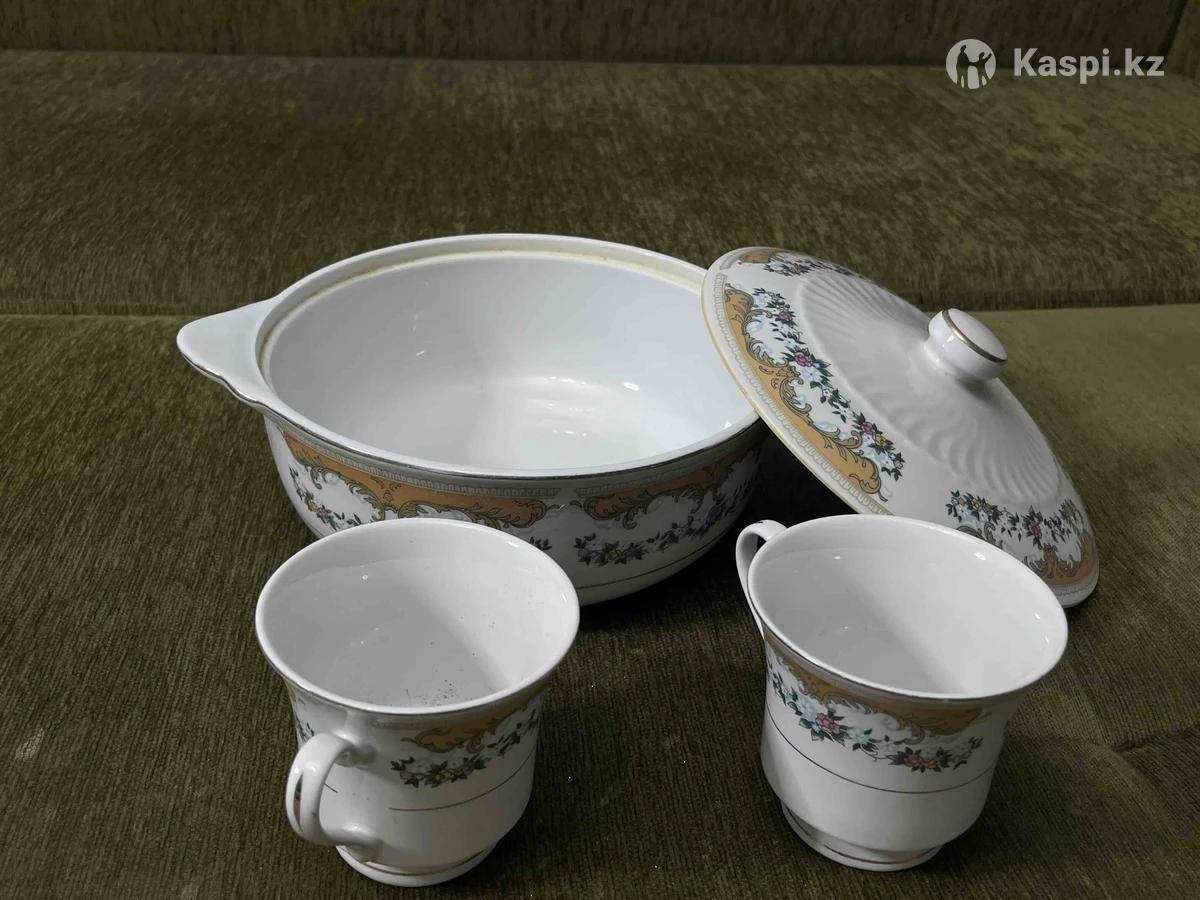 Тут нету молочного стакана, сахарницы и чайника. Больших тарелок 8, маленьких 8, средних 7, кружек 8, супница 1, глубоких чашек 7, еще одна тарелка плоская длинная 1.