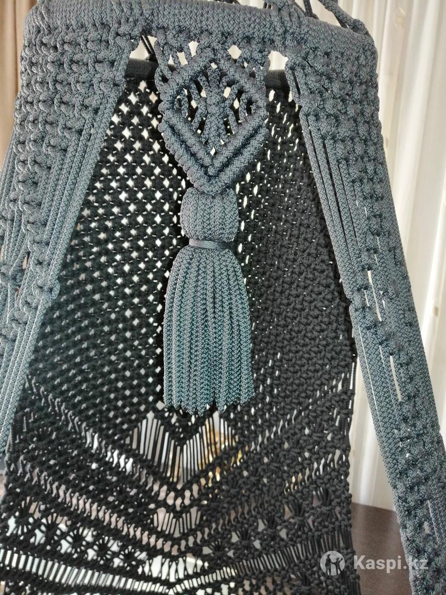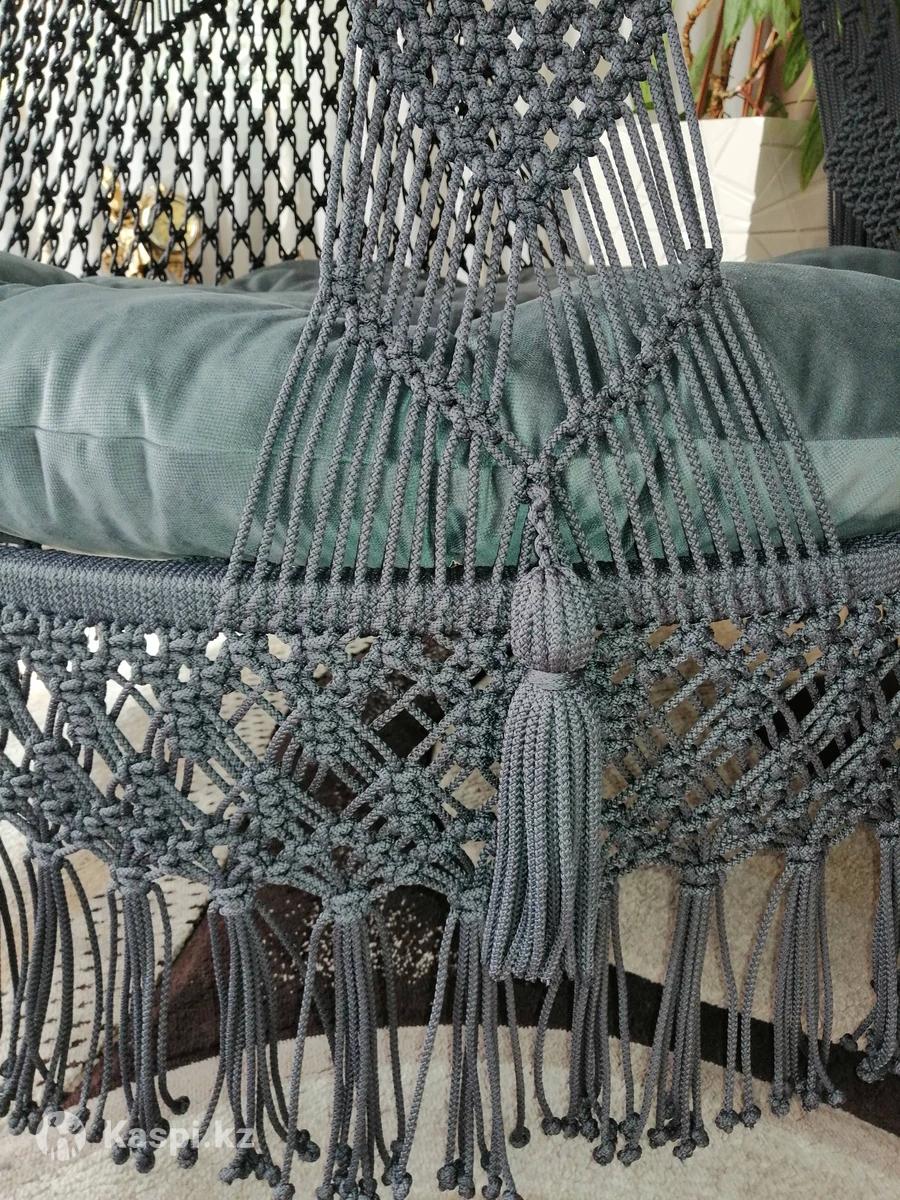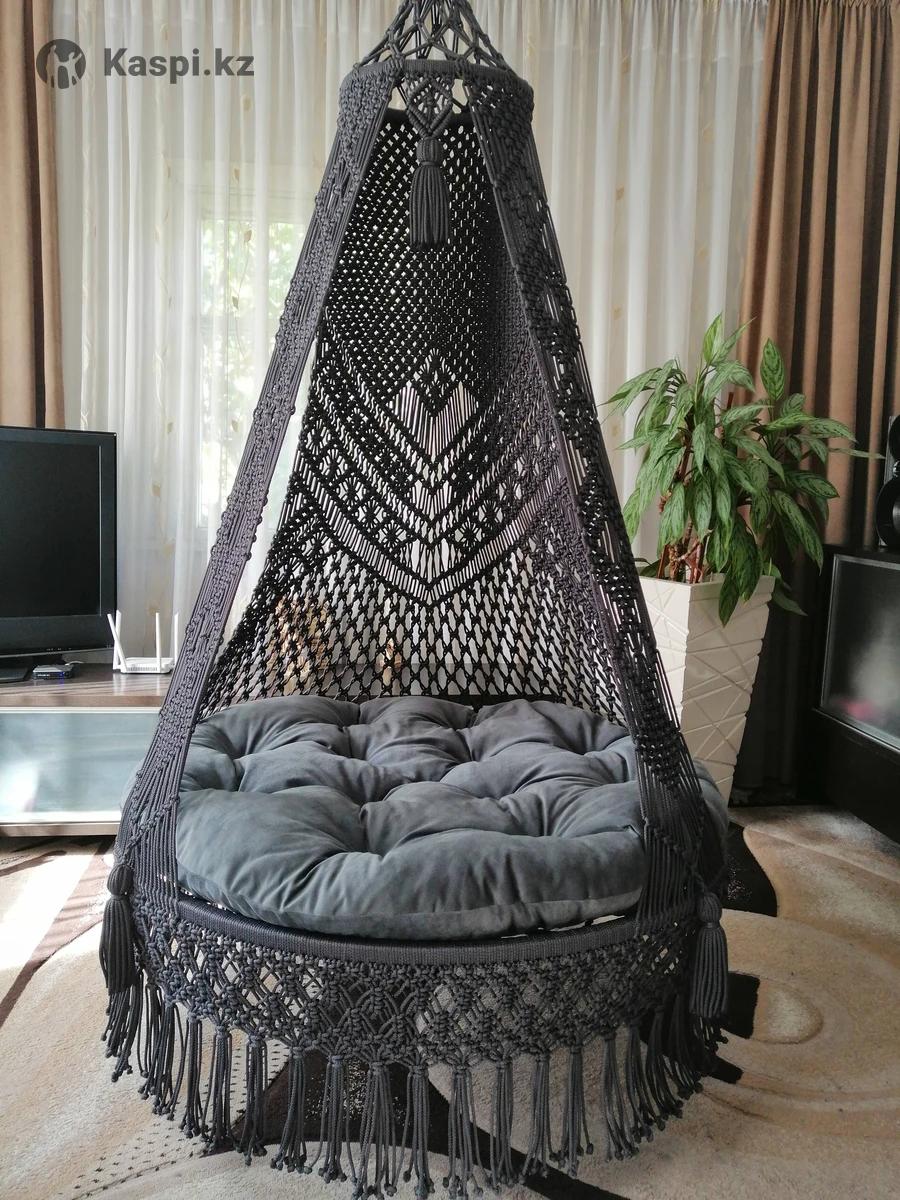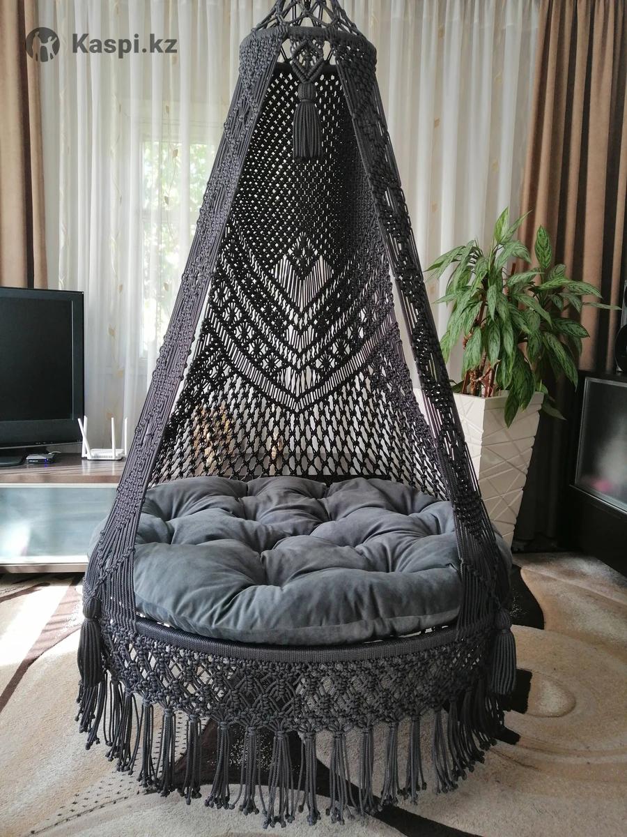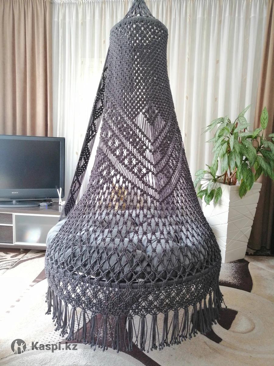 Шатер, ручная работа, изготовлен из гамакового шнура, прочный, износостойкий, практичный и очень комфортный. В комплекте очень мягкая, удобная подушка. Диаметр сиденья 120 см. Выдерживает вес до 150кг.