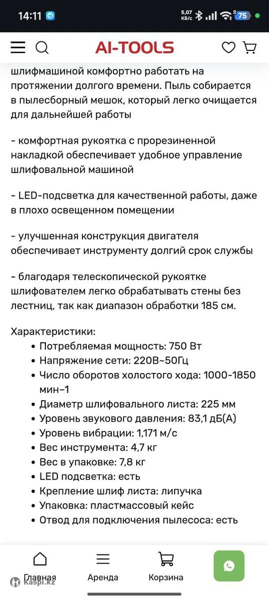 Продается шлифовальная машина со всеми инструментами+ перфоратор хорошем рабочем состоянии. Использовалась использовалась всего один раз, аккуратно, полностью исправна. Шлифомашиной комфортно работать на протяжении долгого времени. Пыль собирается в пылесосный мешок, который легко очищается для дальнейшей работы -комфортная рукоятка с прорезиненной накладкой, обеспечивает удобное управление шлифовальной машиной -LED- подсветка для качественной работы, даже в плохо освещенном помещении - улучшенная конструкция двигателя обеспечивает инструменту долгий срок службы -благодаря телескопической рукоятке шлифователем легко обрабатывать стены без лестниц, так как диапазон обработки 185 см. Отлично подходит для шлифовки стен и потолков после шпаклевки, удобна при ремонте квартир. Характеристики: • потребляемая мощность: 750 Вт • Напряжение: 220В / 50Гц • число оборотов холостого хода: 1000–1850 об/мин • Диаметр шлифовального листа: 225 мм • уровень звукового давления: 83,1 дБ(А) • уровень вибрации: 1,171 м/с • Телескопическая ручка (до 185 см) • LED-подсветка • Подключение к пылесосу • Крепление шлифлиста — липучка • Вес инструмента: 4,7 кг •Вес в упаковке: 7,8 кг В комплекте: • Пластиковый кейс • Пылесборный мешок • Инструкция •отвод для подключения пылесоса:есть Подойдет как для домашнего ремонта, так и для профессионального использования.