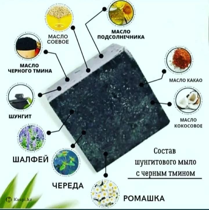 Шунгит сабынының негізгі пайдалы қасиеттері: 1. Теріні терең тазарту: Шунгит кірді, майды және токсиндерді жақсы сіңіреді. 2. Бактерияға қарсы әсер: Безеуге бейім теріге жақсы көмектеседі. 3. Қабынуды басу: Тітіркенуді азайтады, теріні тыныштандырады. 4. Қайта қалпына келтіру: Ұсақ жараларды жазуға көмектеседі, тері регенерациясын тездетеді