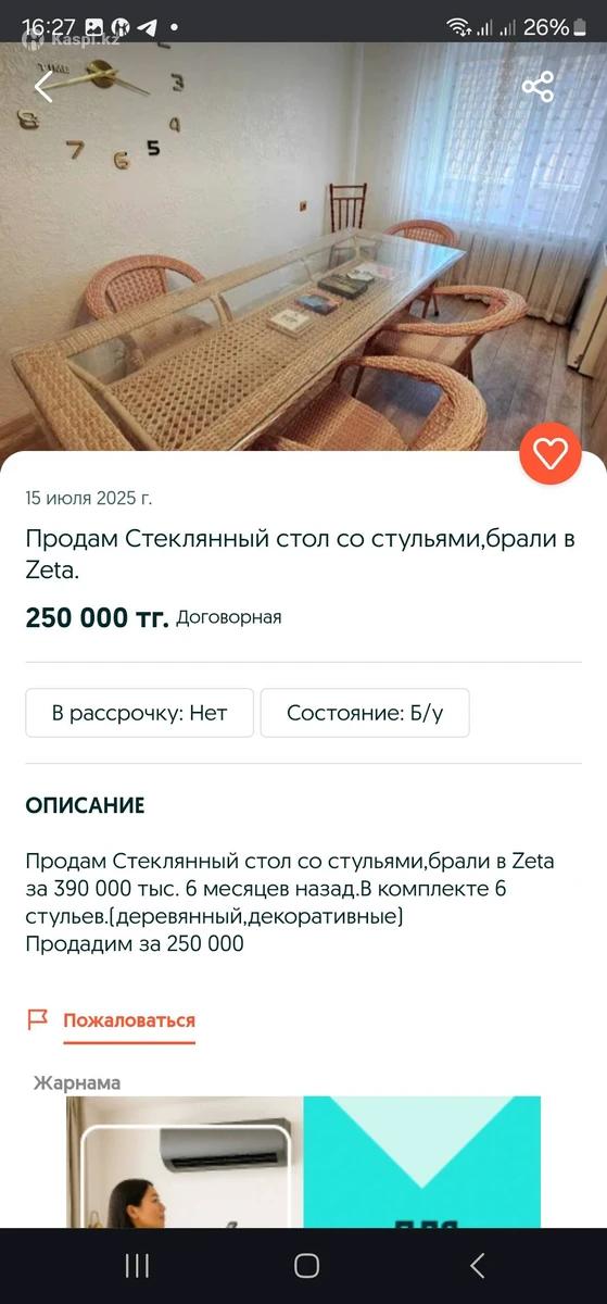 Продам Стеклянный стол со стульями,брали в Zeta за 390 000 тыс. 6 месяцев назад.В комплекте 6 стульев.(деревянный,декоративные) Продадим за 250 000