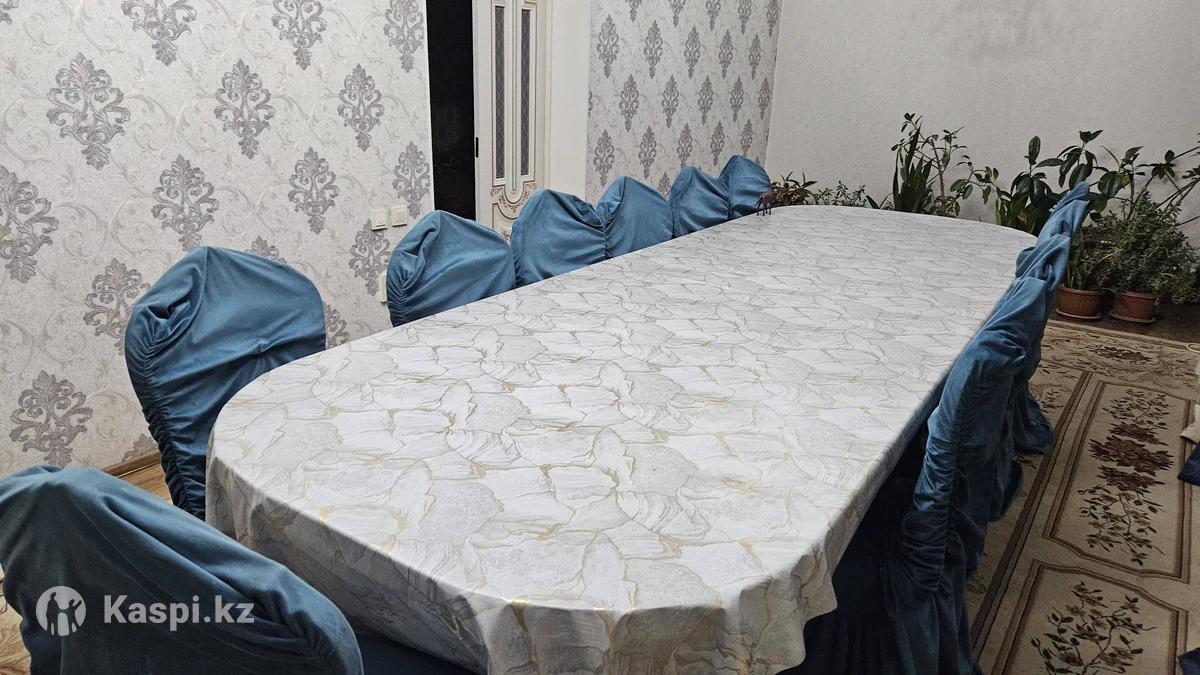 ДЕРЕВЯННЫЙ МАССИВНЫЙ СТОЛ СО СТУЛЬЯМИ, стулья с чехлом, 11 стульев, состояние хорошее. Размер 3 - 3.5 метра, самовывоз, срочно.