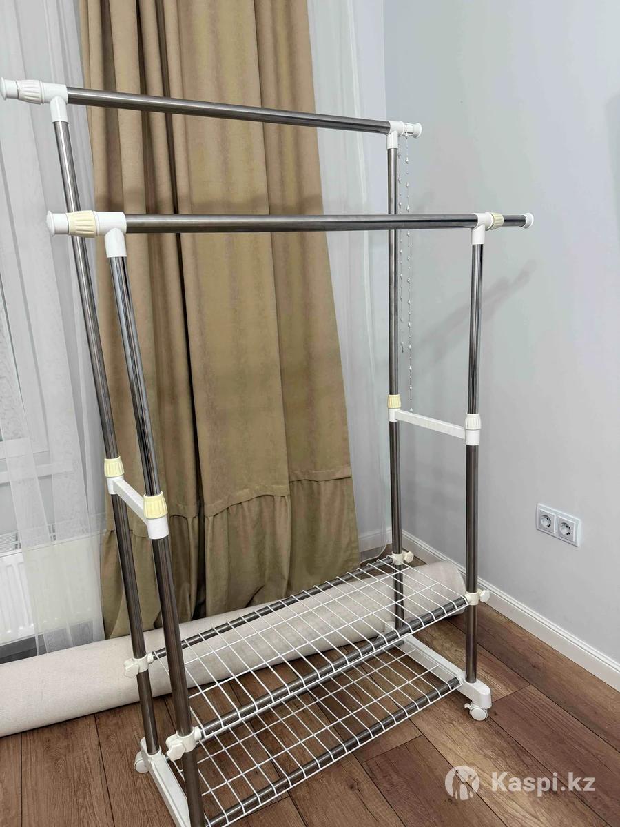 Двухъярусная металлическая стойка на колесиках. Очень удобная и вместительная — можно повесить много одежды и поставить обувь на нижние полки. Регулируется по высоте, легко двигается и собирается. Состояние отличное, почти не использовалась.
