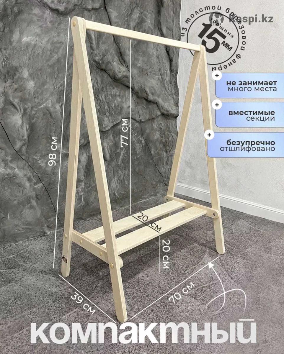 Продам деревянную напольную вешалку / стойку для одежды Продаётся компактная деревянная вешалка для одежды. Отлично подойдёт для магазина, дома, шоурума или детской одежды. ✔ Натуральное дерево ✔ Прочная и устойчивая конструкция ✔ Легкая, но крепкая ✔ Не занимает много места ✔ В хорошем состоянии 📏 Размеры: Высота — 98 см Ширина — 70 см Глубина — 39 см Подходит для одежды, детских вещей, аксессуаров, костюмов и др. 📍 Адрес: 8 мкр, Братьев Жубановых 296 💰 Цена договорная