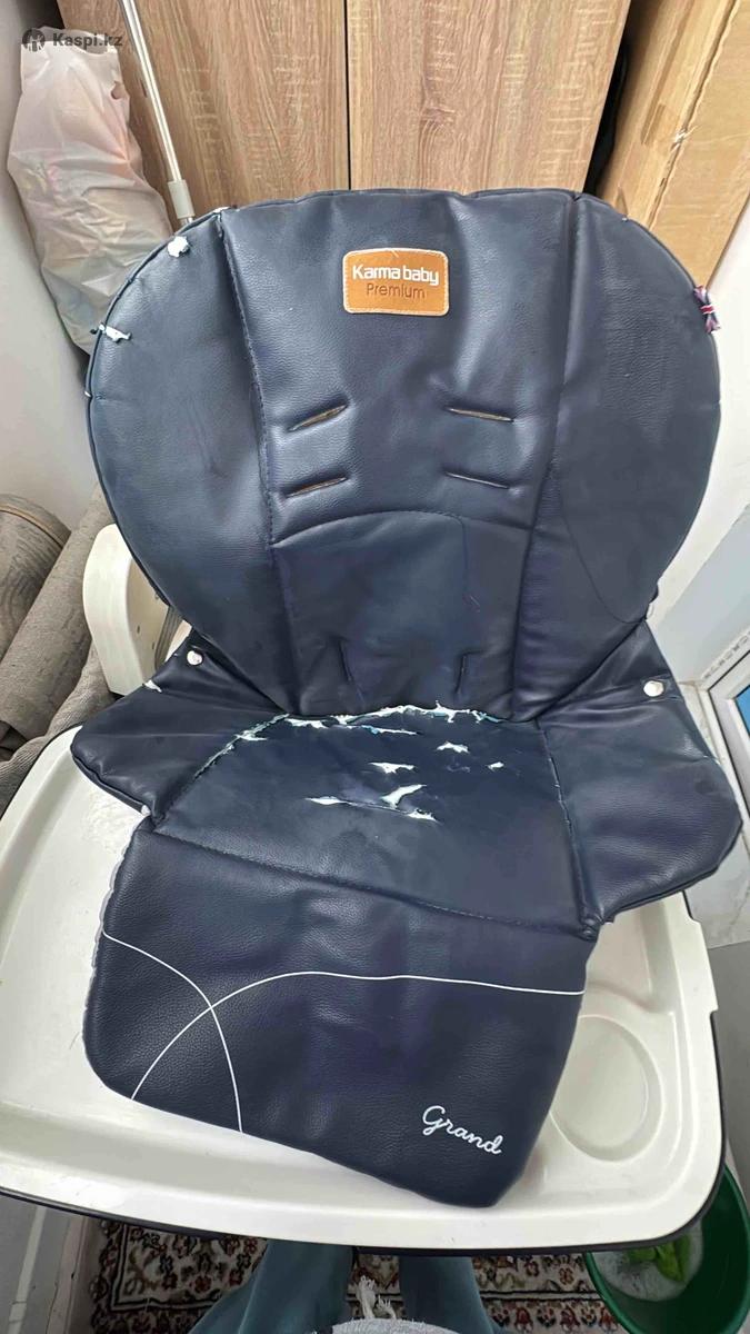 Стульчик для кормления от английского бренда Karma baby От 0-4 лет Вес до 15 кг Цвет серый Регулируемая спинка, поднос, подножка и высота. Есть выемки для стаканов.Сами механизмы в отличном состоянии, накидка на стульчик испорчена сразу говорю