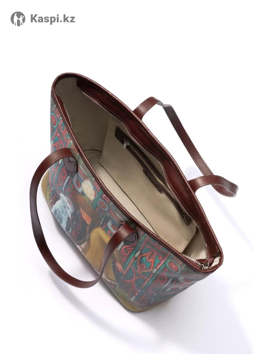 Сумка изготовлена из прочной канвы с элементами из натуральной кожи. Основная часть сумки выполнена из канвы, что позволяет нанести уникальный авторский принт на поверхность сумки. Дно и ручки - из натуральной кожи, что придает изделию форму, устойчивость и стильный акцент. Благодаря вместительному основному отделению в нее легко поместятся книги, ноутбук, личные вещи или покупки, делая сумку универсальным решением для работы, учебы, прогулок и путешествий. Дизайн сумки сочетает в себе минимализм и этнические мотивы, что делает её стильным дополнением к любому образу. Длинные удобные ручки позволяют носить её в руке или на плече, обеспечивая комфорт в течение всего дня. Лёгкий вес и износостойкость делают её незаменимой в повседневной жизни. Подходит для использования в городе, командировках и на отдыхе. Идеальный вариант для студентов, офисных работников и активных людей, которым важны удобство и стиль. Состав: канва (экокожа); ручки, верх и дно - натуральная кожа. Размеры: верх 42 см, дно 32x15 см, высота 28 см, длина ручек 63 см. Одно большое отделение, два внутренних кармана: карман на молнии 25x25 см, накладной карман 12x17 см. Подклад: полиэстер. Особенности: Принт на сумке цельный: передняя сторона отображает центральную часть изображения, задняя - его продолжение.