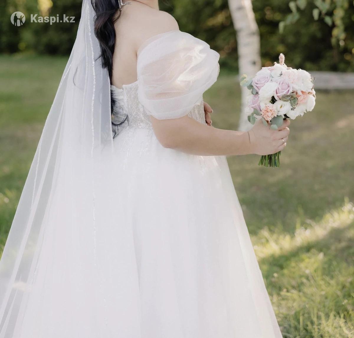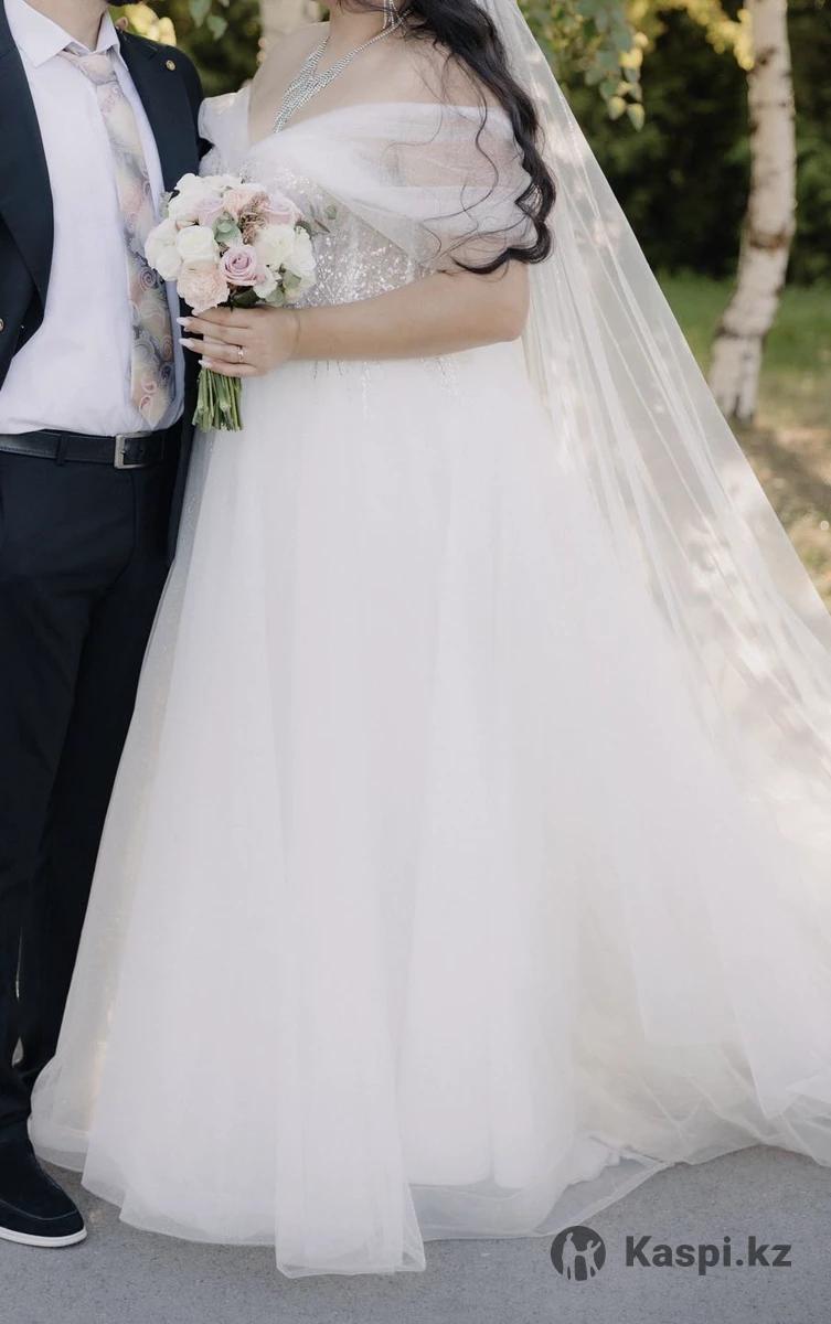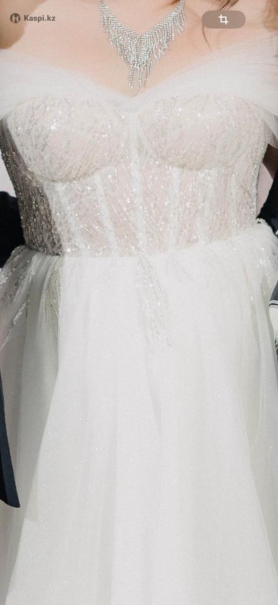 Свадебное платье Размер 46 - 50 Со шлейфом Верх платья выполнен ручной работой из пайеток и бисера Юбка легкая и воздушная с мелким шиммером Платье не тяжелое, спокойно весь день ходила без тяжести, танцы без скованных движений Платье новое , было одето 1 раз После химчистки