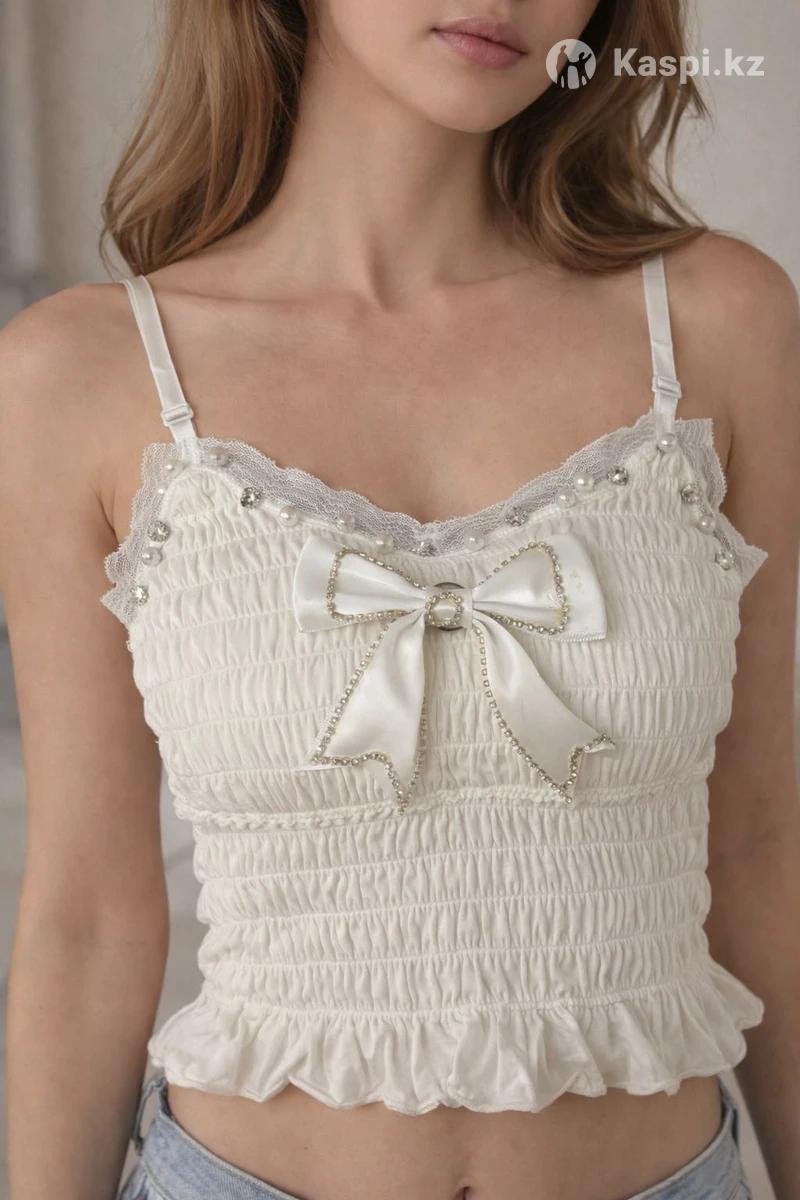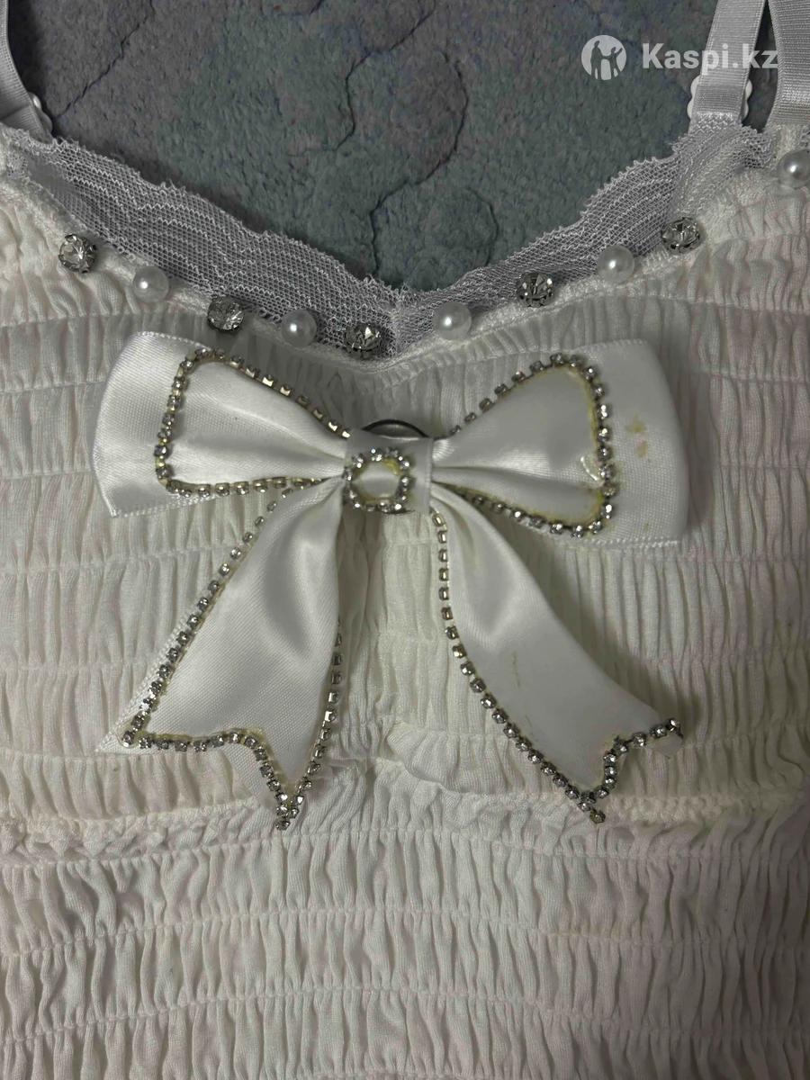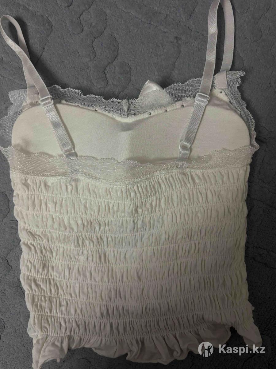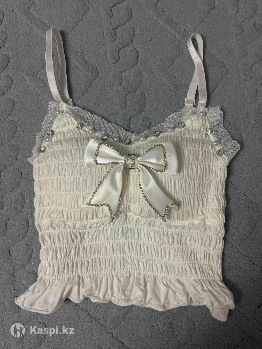 белый топик, не ношенный ни разу, есть дефект маленький это засохший клей на бантике, бантик можно снять. ✅Также внутри пушап то есть можно носить топик без ничего. Лямки регулировать можно. Размер от 36 до 40❗️ткань растягивается, качество хорошее. Летнее‼️