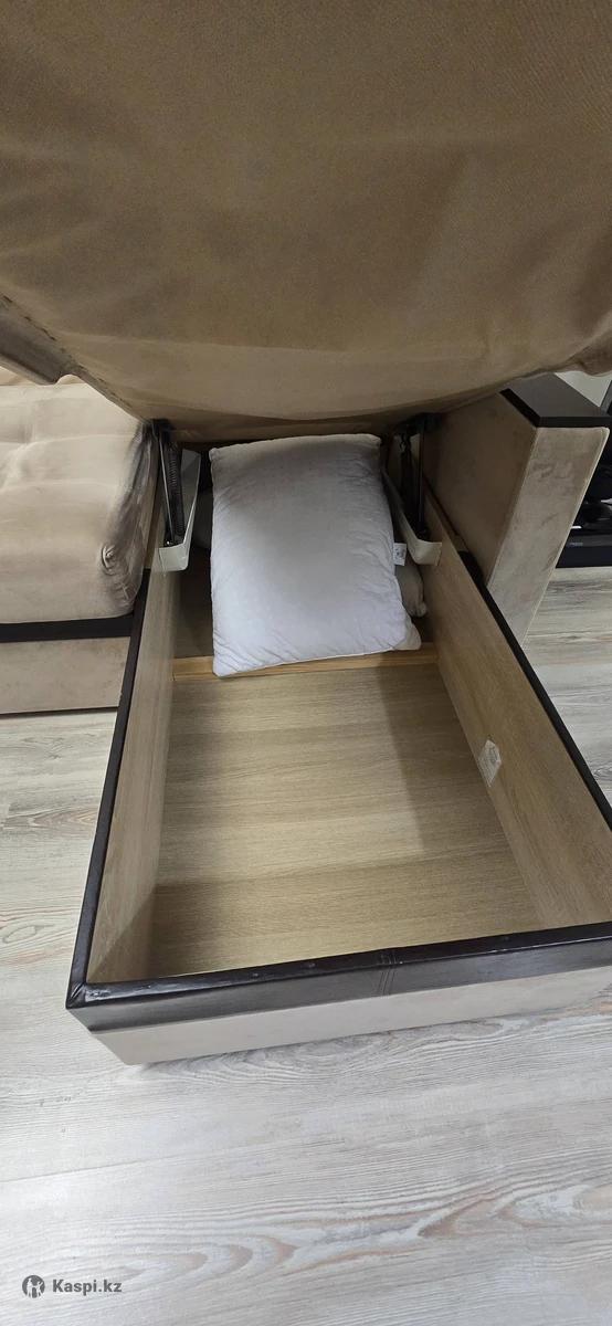 При трансформации находится вплотную к стене, раскладка производится в переднем направлении. Возможность использования как центральный объект интерьера. Посадочное место: пружины «змейка», листовой ППУ, синтепон. Приспинные подушки: формовой ППУ.• Чехлы подушек съемные. Подлокотники: декоративная накладка из МДФ, кофейный столик. Емкость для хранения постельных принадлежностей. Сторона расположения оттоманки универсальна. Сторона расположение стола универсальная и может менять положение (цвет столика и подлокотник дерево, венга)
