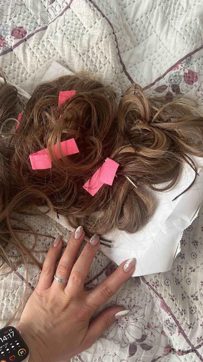 Волосы очень крутого качества , смешаны 3 цвета , темный , блонд и пшеничный , для красивого и натурального рисунка . Брала за 205.000 тг в салоне топ хэир . Сейчас грамовка 110 гр уже закапсулированы . Длина примерно 50 см но подстрижены и разделены для каскада , получается красивый переход на волосах и смотрится натурально а не единым срезом. Носила 2 коррекции но кожа головы чувствительна к капсулам поэтому сняла