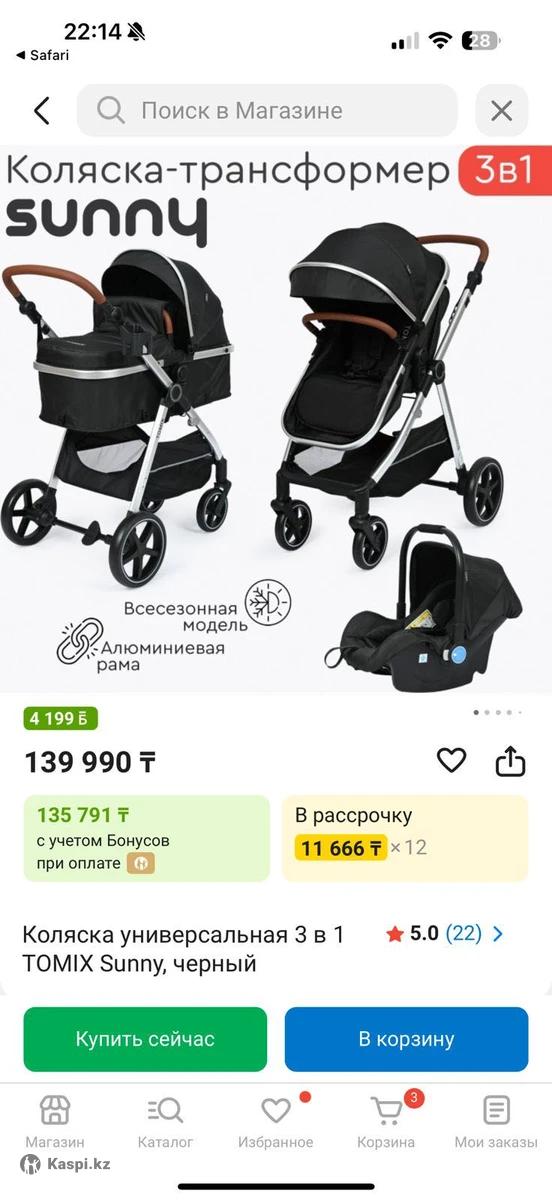 Продаю коляску Tomix Sunny 3 в 1. Покупали в июле. Продаю в связи с тем, что отключают лифт — живем на 10 этаже, поэтому коляска больше не нужна. Коляска почти новая, не потертая, в очень хорошем состоянии. Пользовались совсем немного летом, когда малыш был еще маленький. Всесезонная — подходит для лета и зимы Очень маневренная Удобная и комфортная для ребенка Чистая, ухоженная, без дефектов. Продаю по выгодной цене Полную характеристику и размер коляски смотрите в фото ( скрин с каспи)