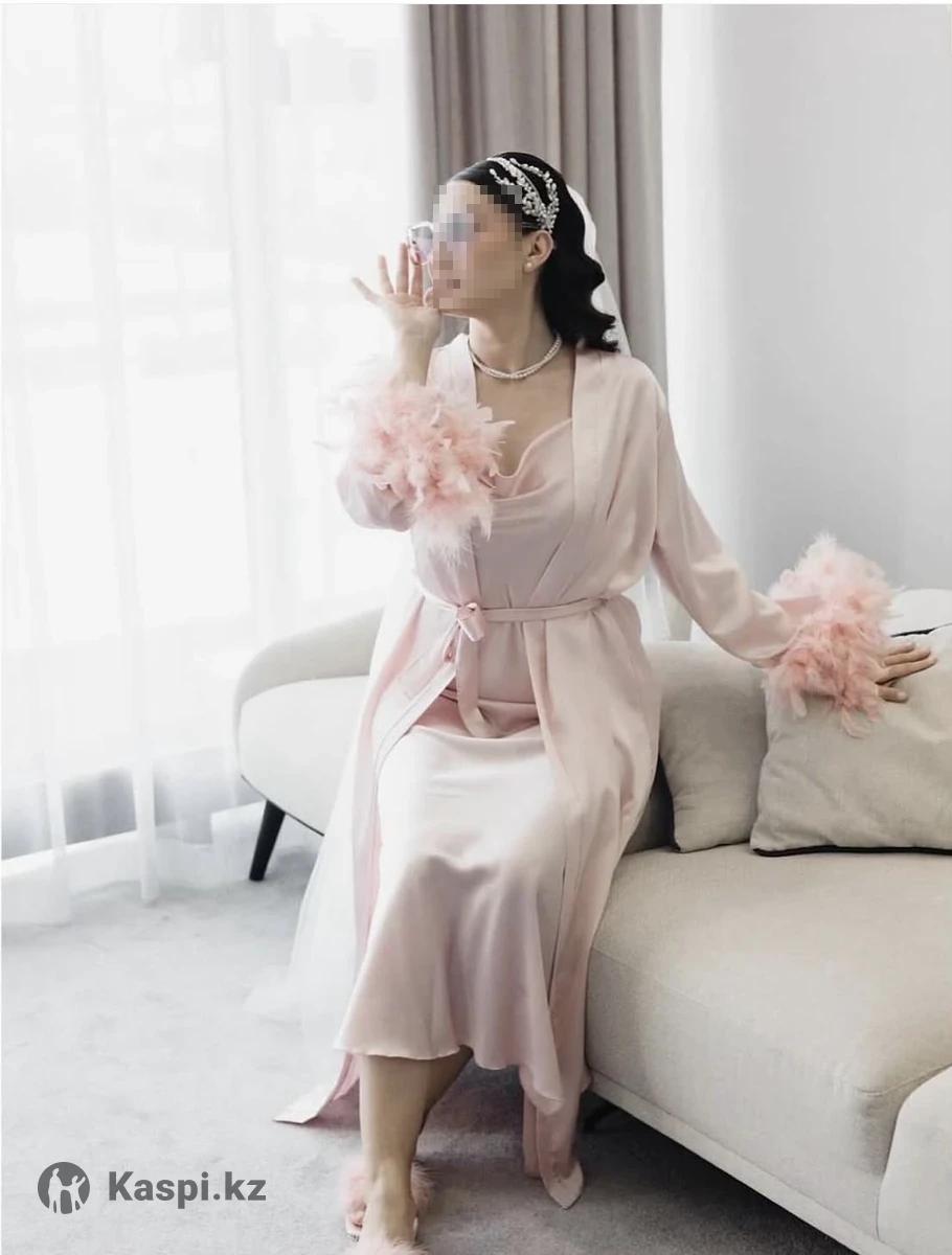Продаю нежнейший шелковый комплект с шикарными перьями на руках богатового нежно- розового цвета. Идеально подойдет для утра невесты, фотосессии, для подарка, и в целом для себя, чтобы красивой ходить дома🤍 покупала в магазине Bua_cosy г.Астана да 39.500 тг продаю за 15 тысяч тг