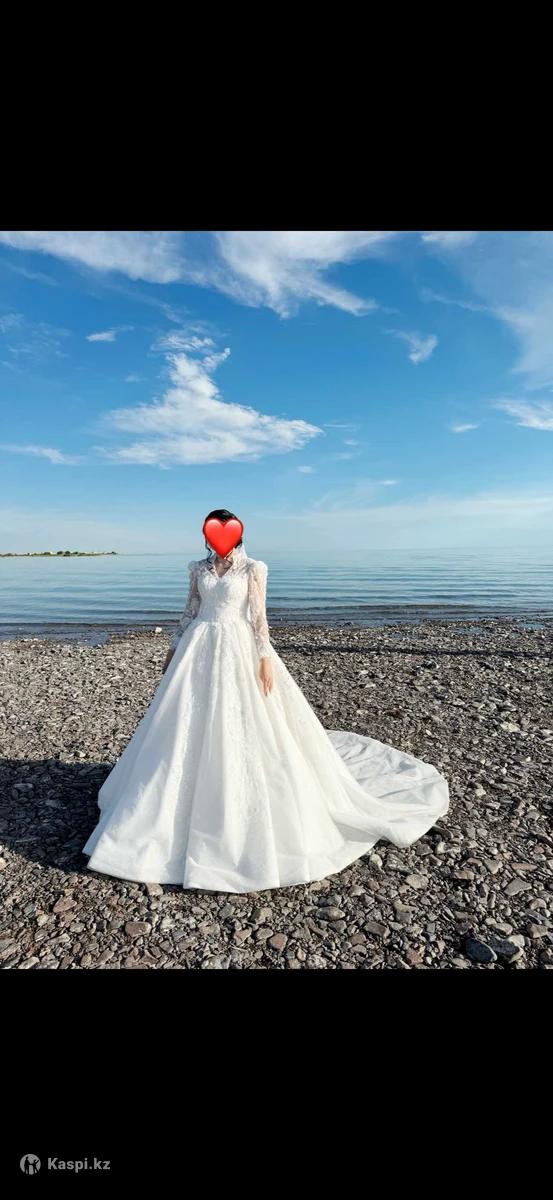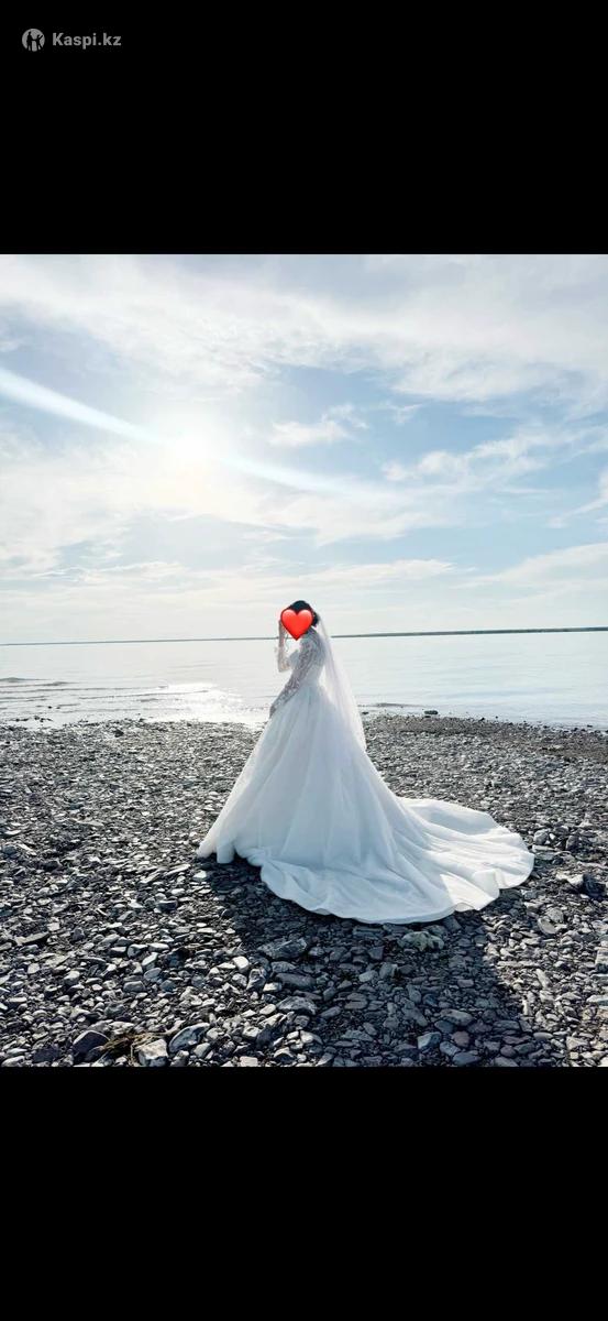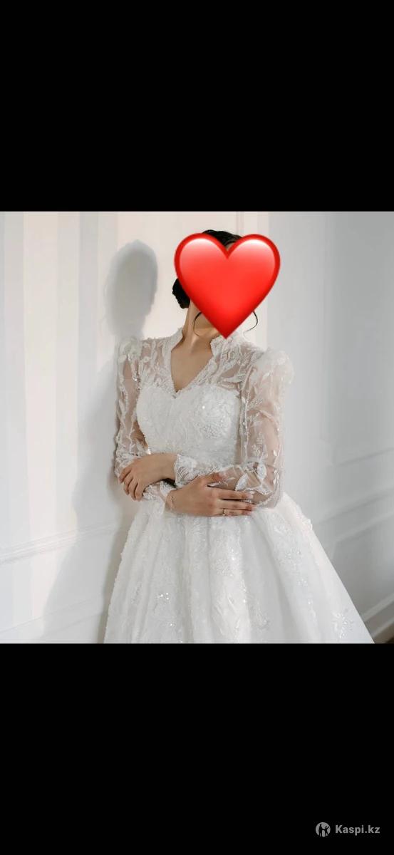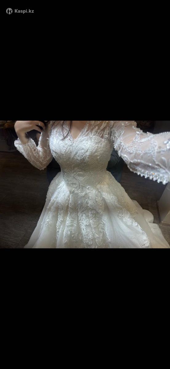Свадебное платье со шлейфом + чехол и подъюбник Продаю изысканное свадебное платье белого цвета с длинными прозрачными рукавами и утончённой вышивкой. Модель украшена пайетками и кружевом, которые красиво переливаются при свете. Имеет пышную юбку и элегантный шлейф, создающий по-настоящему королевский образ. Размер: регулируемый от 44 до 48 Шлейф: есть Состояние: отличное, надето один раз В комплекте: чехол и подъюбник Примерка: возможна Приобреталось за 400 тысяч Платье для невесты, которая хочет выглядеть нежно, элегантно и торжественно в свой главный день. Реальным покупателям могу уступить в цене, на примерку можно будет приехать в любое время.