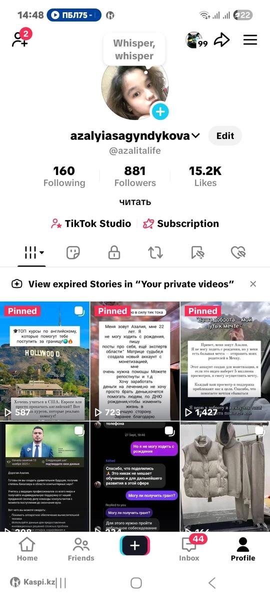 Продаю свой TikTok-аккаунт с монетизацией — 885 подписчиков / 14.9K лайков Этот аккаунт с живой аудиторией и включенной монетизацией. Видео набирают просмотры, а контент вызывает доверие — страница создана с душой ❤️ Поченьу продаю: Меня зовут Азалия, мне 22 года. Я не могу ходить с рождения, но мечтаю пройти лечение и учиться за границей. Хочу собрать деньги на ноутбук и курсы английского, чтобы стать программистом и начать новую жизнь 🌍 💰 Цена: 45 000 тг Аккаунт полностью готов к работе — можно продолжить мой блог, начать свой, подключить рекламу или просто использовать монетизацию.