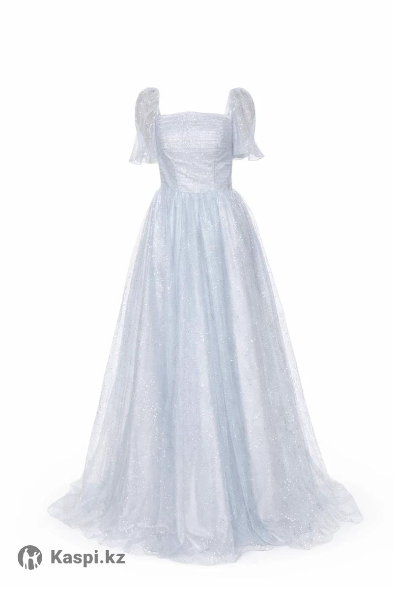 Вечернее платье небесно-голубого оттенка с деликатным мерцанием. Приталенный силуэт с квадратным вырезом подчёркивает линию талии, полупрозрачные рукава-фонарики придают образу утончённость. Пышная юбка в пол выполнена из лёгкого фатина и красиво струится при движении.