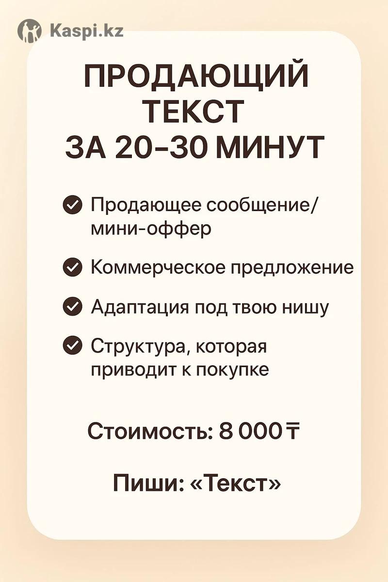 Вам нужно составить предложение клиенту, но не знаете как? Нужно подготовить цепляющий оффер? Написать пост в соцсети? Делегируйте эти важные задачи эксперту по текстам. За 20–30 минут подготовлю именно под ваши цели: — Продающее сообщение или — Мини-оффер или — Коммерческое предложение. Кому подходит: 1. Вам нужен профессиональный и сильный текст. 2. Всем, кто хочет делегировать тексты эксперту. 3. Тем, кто хочет увеличить продажи.