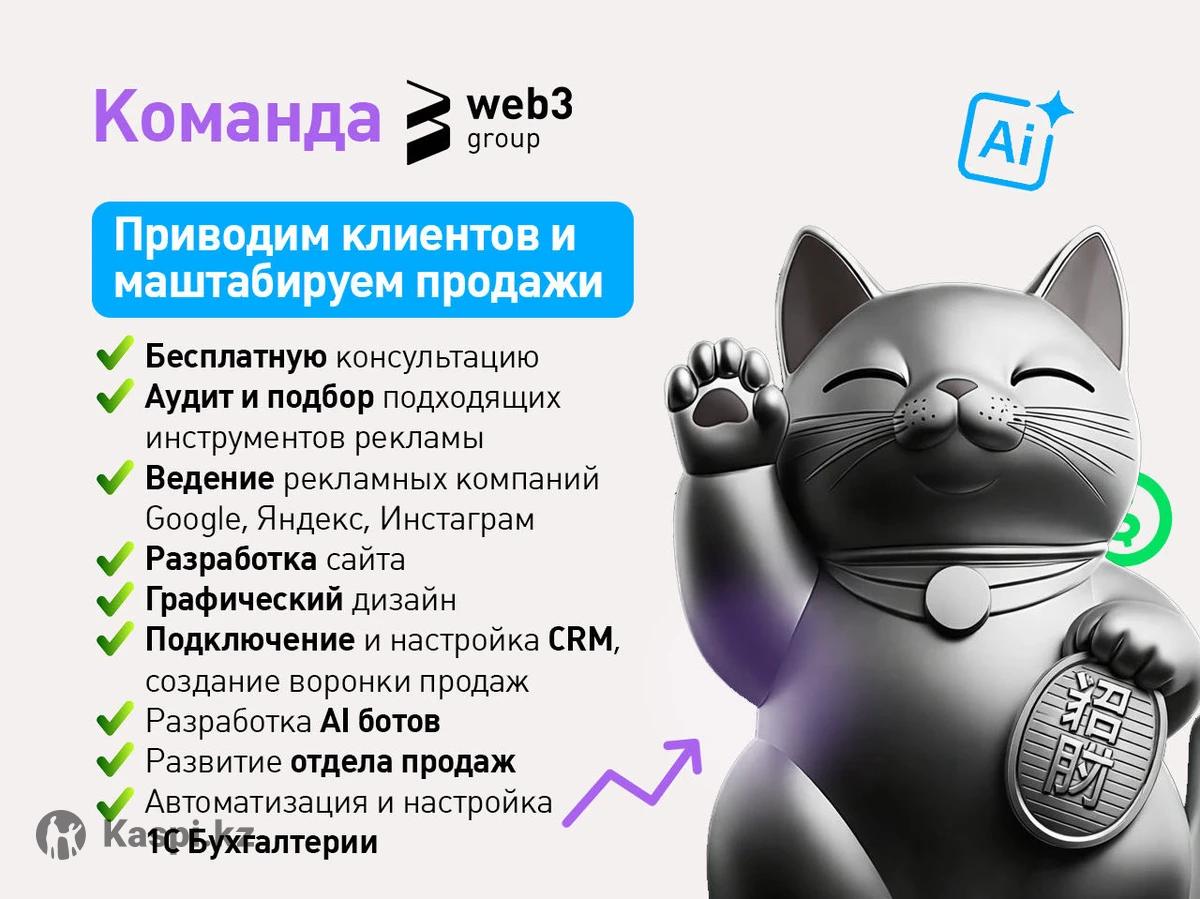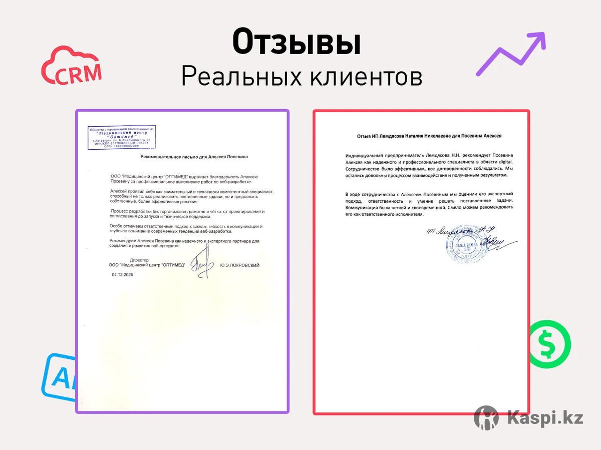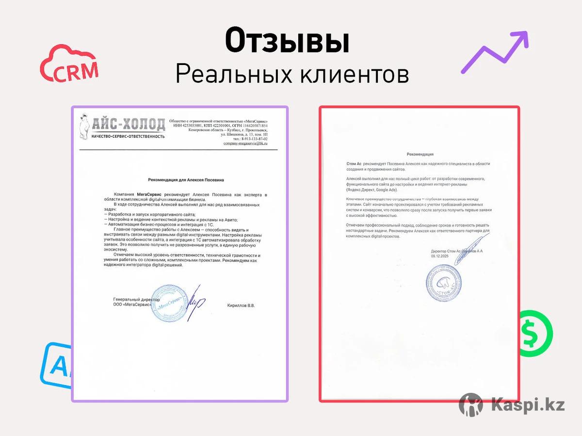 🚀 Приводим клиентов и масштабируем продажи. Меня зовут Алексей, я специалист по интернет рекламе, разработки сайтов и интеграции CRM систем с опытом работы 15 лет. Работая со мной вы работаете с целой командой сильных специалистов по интеграции любых интернет-решений от лендинга до мобильных приложений. 🔍 Бесплатно для новых клиентов Консультация + подбор оптимальных рекламных инструментов Покажем, где вы теряете деньги и что реально будет работать именно в вашем бизнесе. 💼 Наши услуги ✔️ Ведение рекламных кампаний: • Google Ads • Яндекс Директ • Instagram / Meta ✔️ SEO / СЕО продвижение сайтов ✔️ Разработка сайтов (лендинги, сайты под продажи) ✔️ Графический дизайн (баннеры, креативы, оформление) ✔️ Подключение и настройка CRM ✔️ Создание воронок продаж ✔️ Разработка AI-ботов (продажи, поддержка, автоворонки) ✔️ Разработка ботов и mini-app приложений. ✔️ Развитие и настройка отдела продаж ✔️ Автоматизация и настройка 1С Бухгалтерии 🎁 Бонусы для новых клиентов 💰 $300 на Google Ads 💰 50 000 тг на Яндекс Директ (официальные бонусы для старта рекламы) ✅ Наши преимущества: • Полный цикл запуска онлайн-продаж • Работаем на результат, а не на объем • Опыт более 15 лет • Используем самые актуальные инструменты и AI-решения • Понятная аналитика и прозрачная работа 🌍 География Работаем с бизнесом в Казахстане и России 📩 Напишите или позвоните нам — и получите консультацию.
