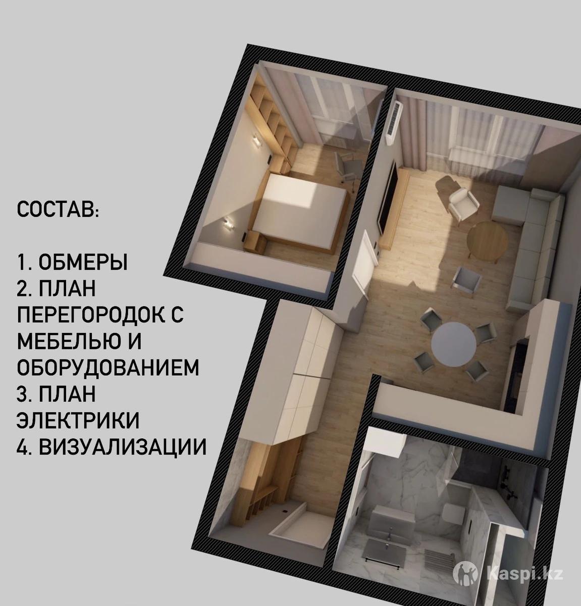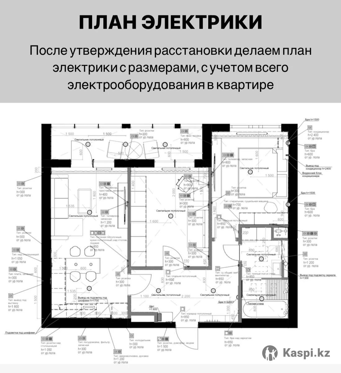 Проект квартиры для работы с подрядчиками: План перегородок с мебелью и оборудованием, План электрики, визуализации