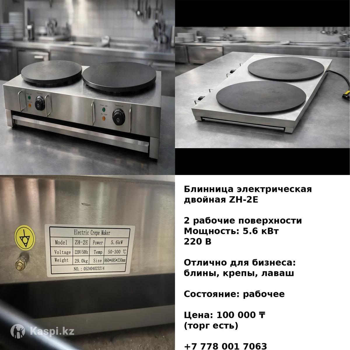 Продам профессиональную двойную блинницу (crepe maker) в хорошем рабочем состоянии. Модель: ZH-2E Количество поверхностей: 2 Мощность: 5.6 кВт Напряжение: 220 В Температура: до 300°C Материал: чугунные рабочие поверхности Вес: около 29 кг Идеально подходит для: — кафе и фастфуда — уличной торговли — приготовления блинов, крепов, лаваша Состояние: рабочее, есть следы использования (на работу не влияет). Цена: 90 000 тг (возможен разумный торг) Пишите/звоните