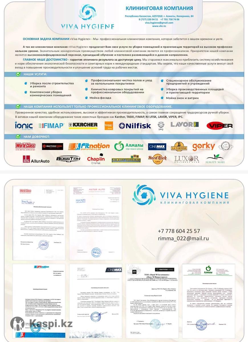 VIVA HYGIENE — профессиональный клининг для вашего комфорта! Мы предлагаем: • Генеральную и ежедневную уборку квартир и домов • Чистку офисов и коммерческих помещений • Мытьё окон, химчистку мебели. Почему выбирают нас? — Опытная команда — Безопасные и эффективные средства — Гарантия чистоты и пунктуальность.