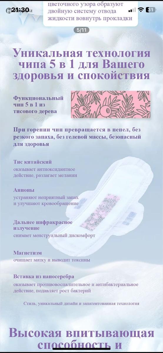 Анионовые прокладки премиум-класса Ультратонкие (всего 1 мм), дышащие и безопасные! 1.Снимают менструальный дискомфорт 2.Защищают от бактерий и неприятного запаха 3.Улучшают кровообращение и сон 4.Индивидуальная герметичная упаковка 5.Изготовлены по японской технологии