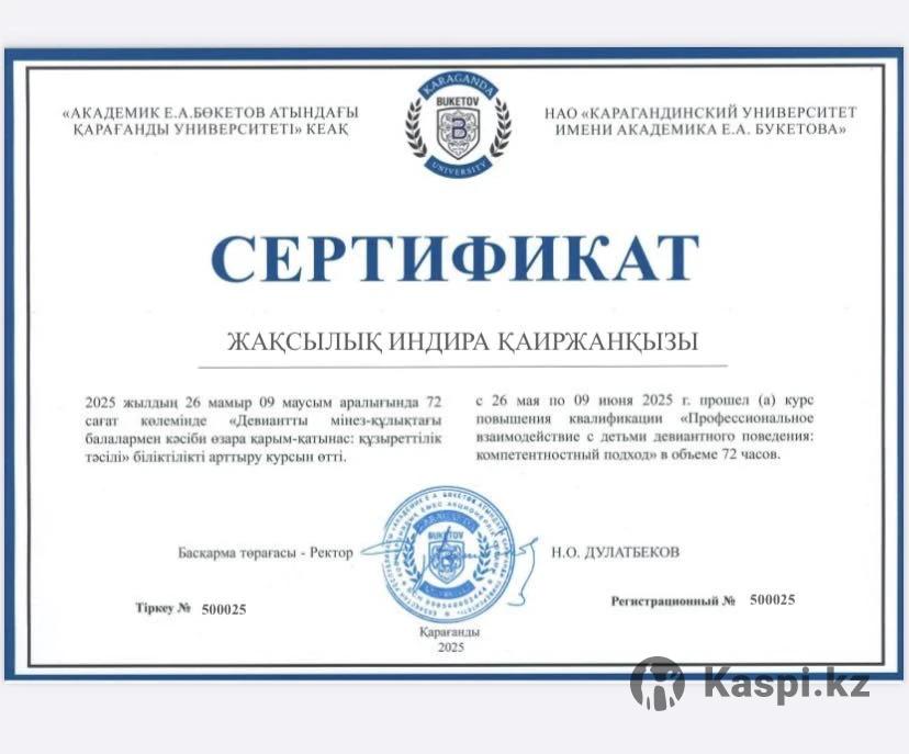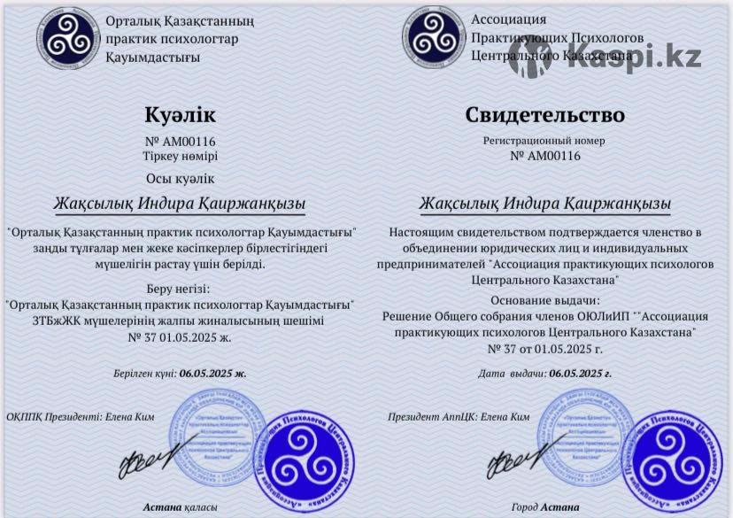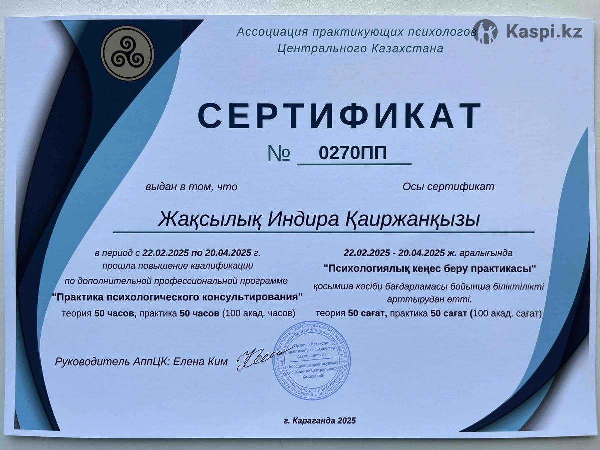 Караганда | Онлайн и очно | Член Ассоциации психологов Центрального Казахстана Меня зовут Индира, я дипломированный практикующий психолог, специалист по детско-родительским отношениям, вопросам самооценки, тревожности и внутреннего выгорания. Работала в коррекционном центре с детьми с особыми потребностями, сейчас работаю в университете, также веду частные консультации и авторские тренинги. Образование: 1. НАДО Карту им.Букетова по специальности: Психология 2. Сертификат «Профессиональное взаимодействие с детьми девиантного поведения. Компетентный подход». 3. "Практика психологического консультирования" Я провожу: ✔ Индивидуальные консультации для детей, подростков и взрослых ✔ Тренинги для девушек о личных границах, самоценности, уверенности в себе ✔ Тренинги для детей по теме безопасных границ («Правило нижнего белья») 🌿 В работе со мной — мягкое сопровождение, уважение к вашей уникальности и практичные техники, которые помогают по-настоящему понять себя и свои чувства. С чем могу помочь: — Тревожность, страхи, обиды — Неуверенность в себе, заниженная самооценка — Эмоциональное выгорание, стресс — Семейные и личные границы — Переживание травматического опыта Почему стоит обратиться ко мне: ✨ Безопасная атмосфера — никаких «диагнозов» и шаблонов ✨ Практика с результатом — помогаю не запутаться в теории, а реально почувствовать перемены ✨ Индивидуальный подход — вы уникальны, и ваш путь тоже будет особенным 💬 Консультации проходят на русском и казахском языках. 💳 Стоимость: — Первая консультация — 8000тг — Абонемент на 8 сеансов — 75 000 тг
