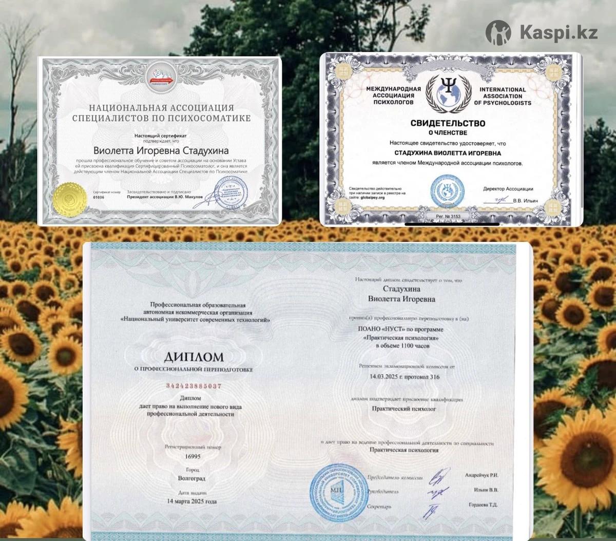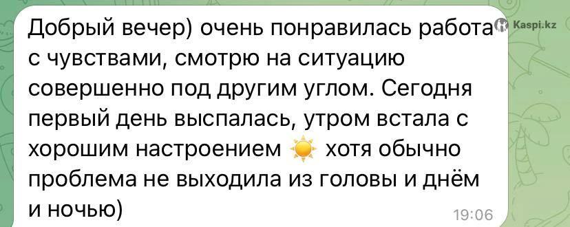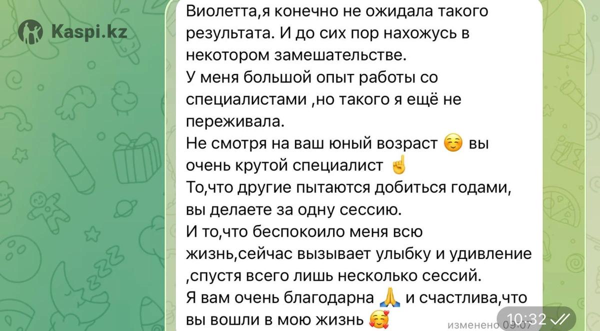 Привет ✨ отправь слово ЗНАКОМСТВО и я перешлю отзывы + бесплатный гайд ''Как перестать прокручивать мысли перед сном '' 😌 ✨ Меня зовут Виолетта , мне 25 лет. В психологии 4 года. 🫂 Я - практический психолог, работаю с тем, что мешает чувствовать себя спокойно и уверенно. 📖 Использую современные подходы: КПТ третьей волны, схемотерапию, психодинамику, репроцессинг и гипнотические техники. Мои сессии проходят 60 - 90 мин, чтобы мы успели дойти до самой сути. Обратите внимание: чем больше сессий приобретаете - тем ниже прайс .Так я проявляю заботу о каждом клиенте и хочу помочь оставаться в процессе терапии. Прайс: Меруерт, доброй ночи! Прошу прощения что поздно. Отправляю рассылку каждому клиенту 🙏 В связи с тем, что не у каждого есть время проводить сессии по 120 мин , много обращений я слегка корректирую время сессий и , соответственно, прайс ✨ На сайте не успела обновить информацию 3 сессии 60 - 90 мин (- 25%) - 28.500 тг 5 сессий '60 - 90 мин (- 36%) - 40.000 тг 10 сессий 60 - 90 мин (- 40%) - 75.000 тг Одноразовая сессия 60 - 90 мин - 12.500 тг Есть внутренняя рассрочка 👩🎓 Выпускница школы Владимира Макулова, и продолжаю активно обучаться. 🖊️ Работаю с тревогой, самооценкой, отношениями, чувством вины, внутренним напряжением и просто моментами, когда кажется, что “все слишком”. 💥 Иногда достаточно одной сессии для решения запроса. Но все индивидуально. В среднем пять. Диагностика бесплатная для новых клиентов. Есть внутренняя рассрочка. За моей практикой - 500+ часов работы и много теплых историй клиентов, которым стало легче. Возможно, именно сейчас тот момент, когда стоит разобраться и начать чувствовать себя лучше 🌿