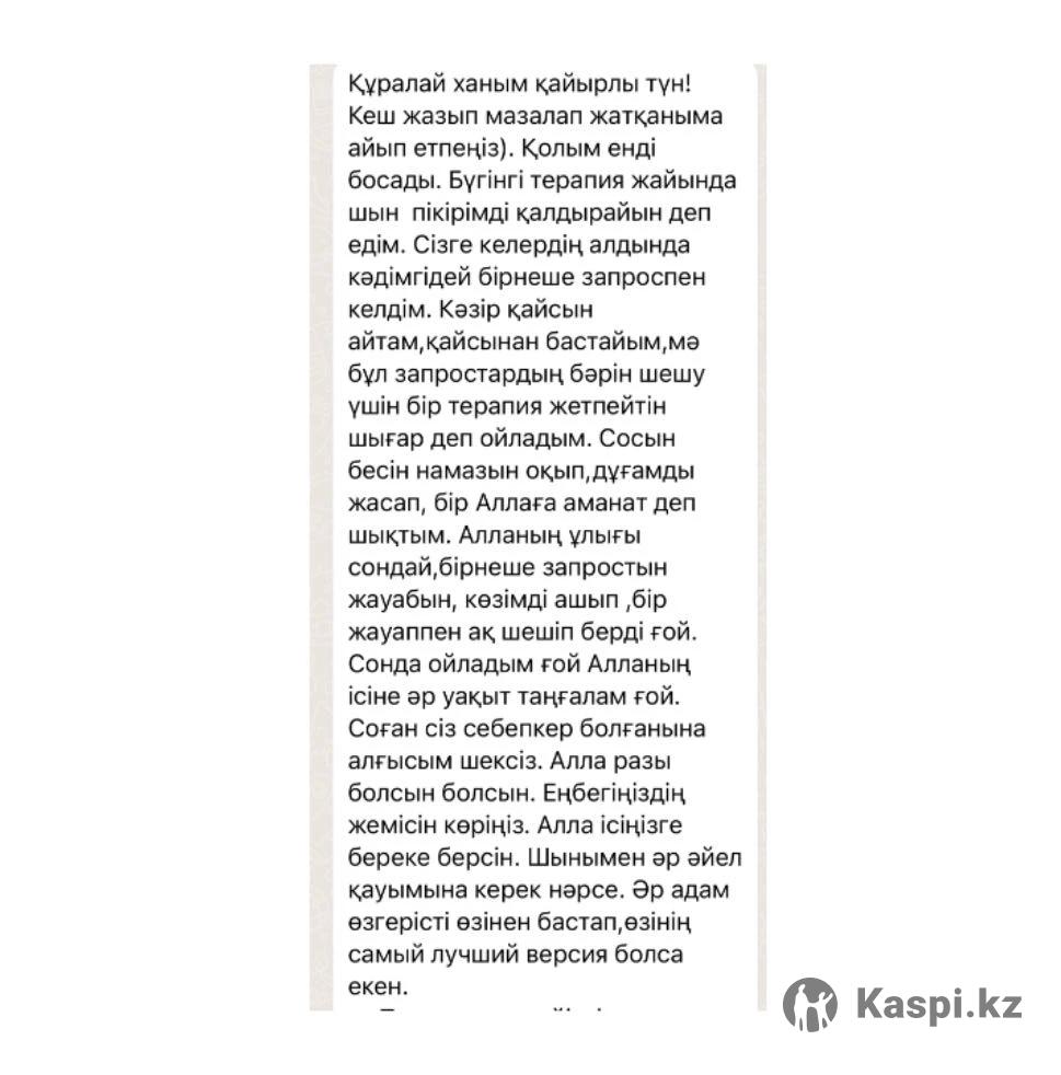 Егер өміріңізде қиын кезеңдер болып жатса, (стресс,депрессия,өз-өзіңізді үнемі кінәлі сезіну,өз-өзін жазалау т.б.) ,өзіңізді танып,самооценкаңызды көтеріп, жаңа өмір бастағыңыз келсе немесе жай ғана ішіңіздегі сырды ақтарып,жеңілдегіңіз келсе мен көмектесуге дайынмын.