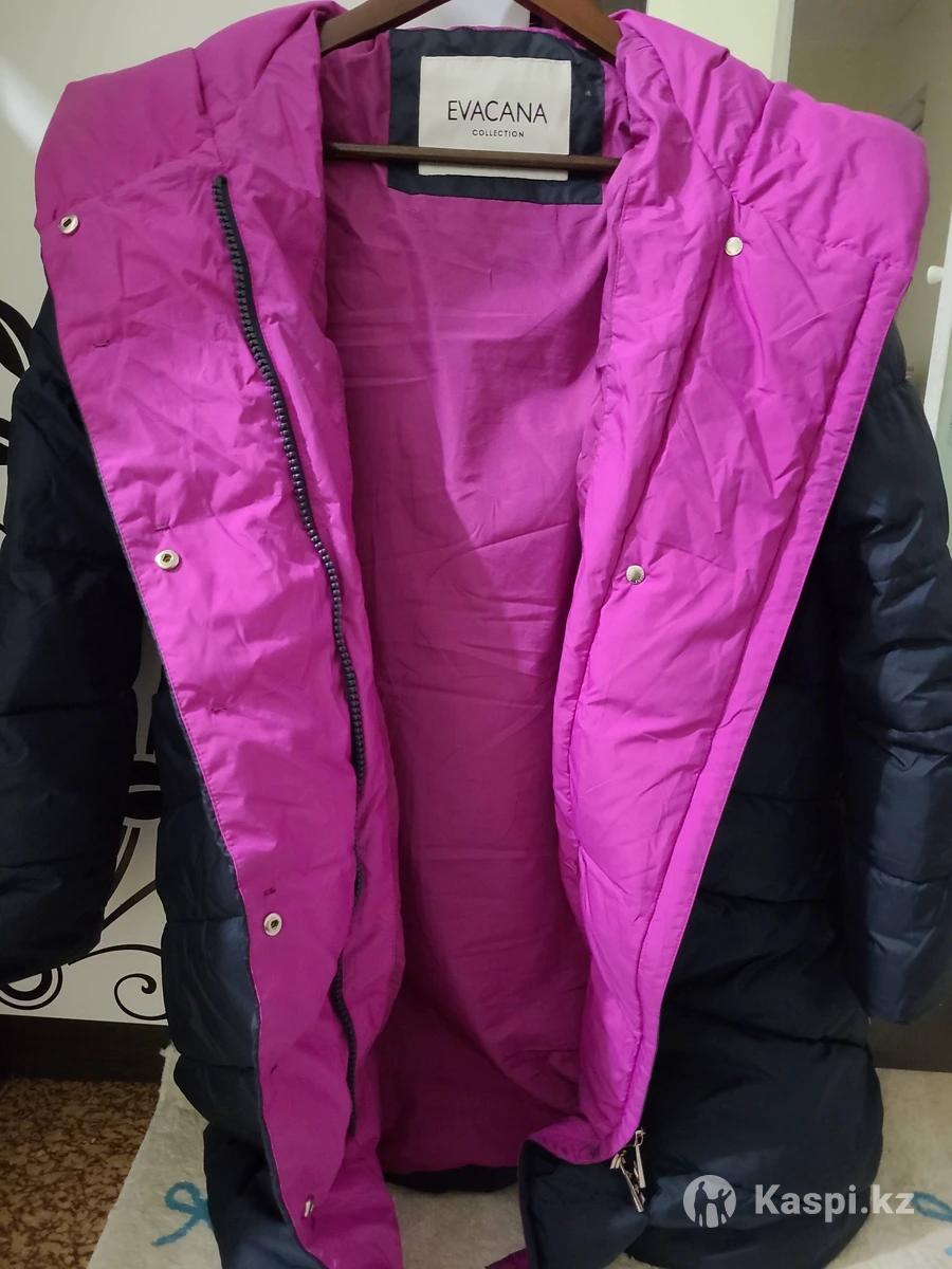 Куртка зимняя с капюшоном из полиэстера темно-синего цвета с подкладом из сиреневого цвета , средней длины.Качество отличное. В отличном состоянии. Возможен торг.