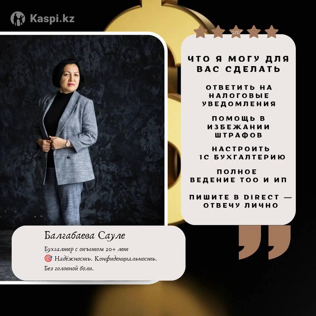 Бухгалтер для ИП — от регистрации до полной отчетност 📌 Импорт с Китаем, Россией и др страны 📌Экспорт 📌 Обслуживание ИП на УСН (форма 910, 913, 701, 300, 200,328 и др) 📋 Сдача налоговых и пенсионных отчетов 📈 Расчет ИПН, ОПВ, СО, ОСМС — без ошибок и задержек 🛠 Помощь при уведомлениях, письмах от УГД 📑 Корректировка старых отчетов, устранение нарушений 📌 Восстановление учета за прошлые периоды 📞 Консультации по налогам, патенту, переходу с режима на режим 📍 Работаю удаленно по всему Казахстану 💼 Опыт более 20 лет — гарантирую надежность и спокойствие