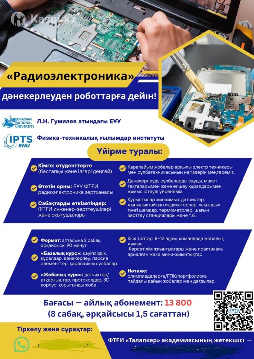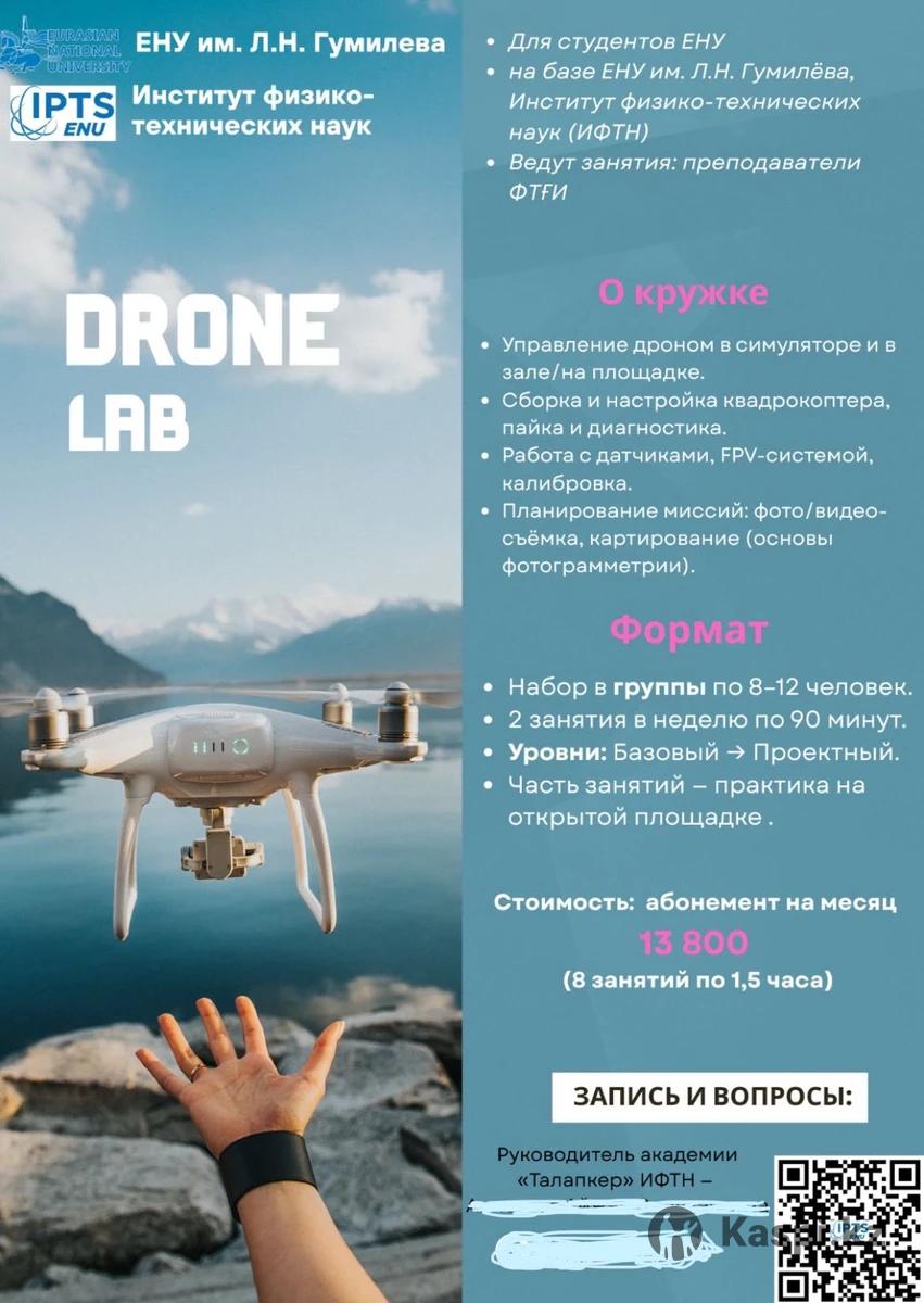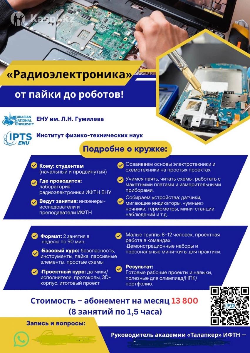 Радиоэлектроника: Освоите основы электроники, схемотехники. Научитесь паять, собирать и программировать устройства, датчики и тп. DroneLab: управление, сборка и настройка, пайка и диагностика дронов. Планирование миссий, фото и видео съемка и тп. Занятия проводят профессоры-преподаватели в группах от 5 человек в ЕНУ имени Л.Н. Гумилева