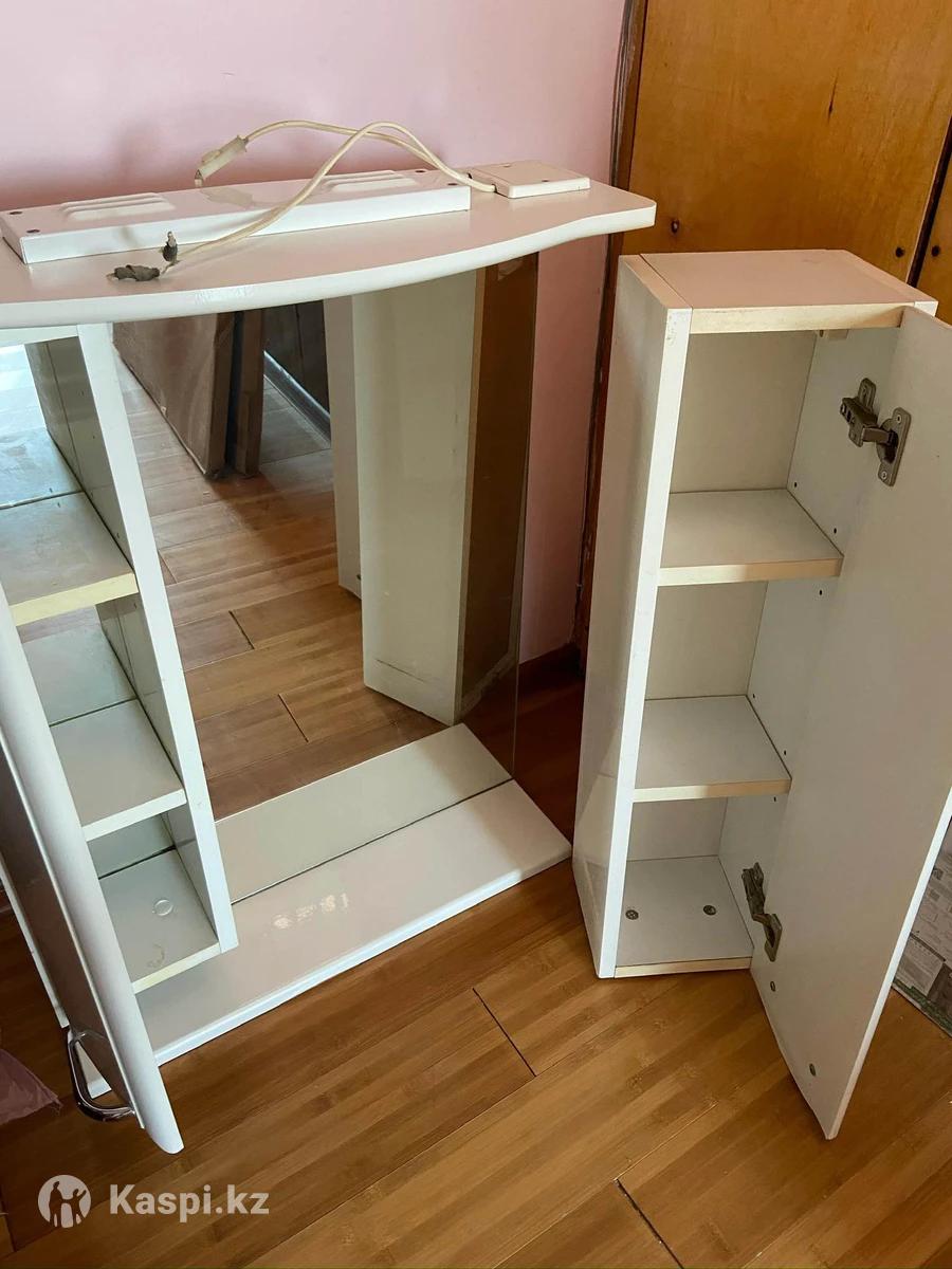Продаю зеркало с тумбами + раковина со смесителем Описание комплекта: 1.Зеркало с тумбами для ванной •Цвет: белый глянец •Две боковые тумбы с ручками •Просторное зеркало •Верхняя полка с местом под светильник (электропроводка в комплекте) •Состояние: отличное 2.Раковина со смесителем •Материал: керамика •Смеситель в комплекте •Монтаж на стену •Состояние: хорошее, без трещин Можно продать вместе или по отдельности.