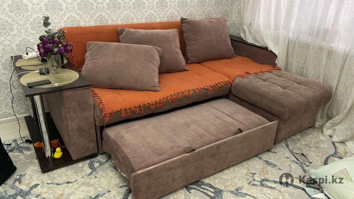 Б/у раскладной диван в хорошем состоянии. Длина — 2,55 м, ширина — 1,45 м. В сложенном виде глубина — 87 см. Диван раскладывается, удобный для сна. В комплекте 3 большие подушки. Сбоку предусмотрен удобный мини-столик. Практичный, комфортный и функциональный. Длинная часть дивана открывается и имеет удобное хранилище для белья и вещей.