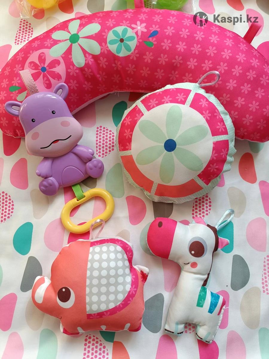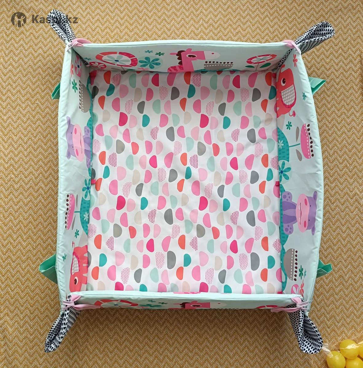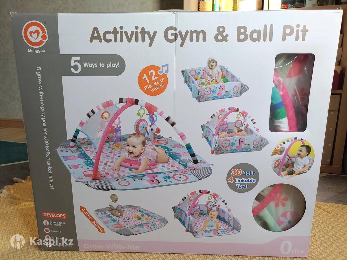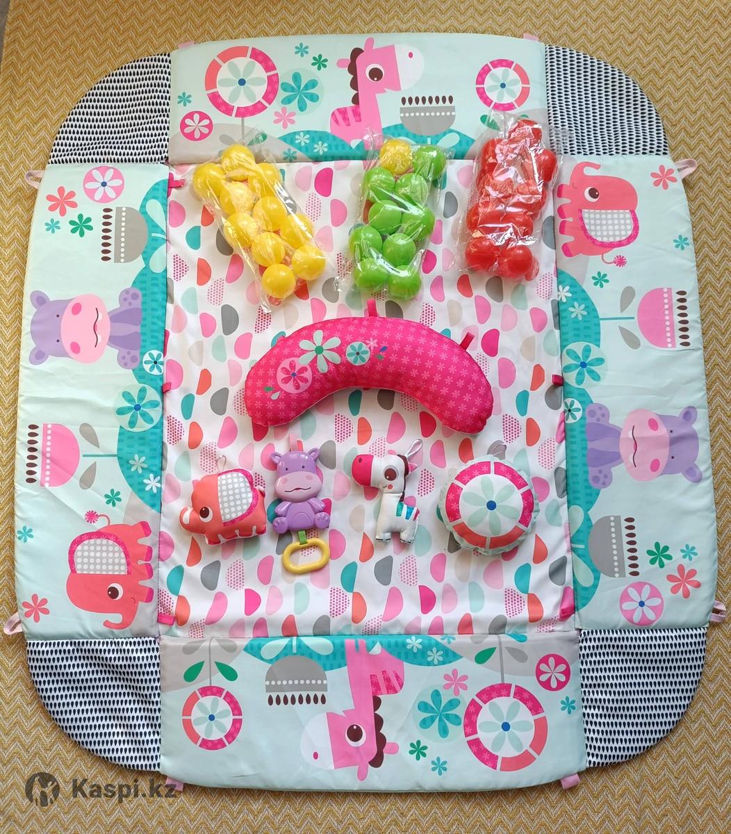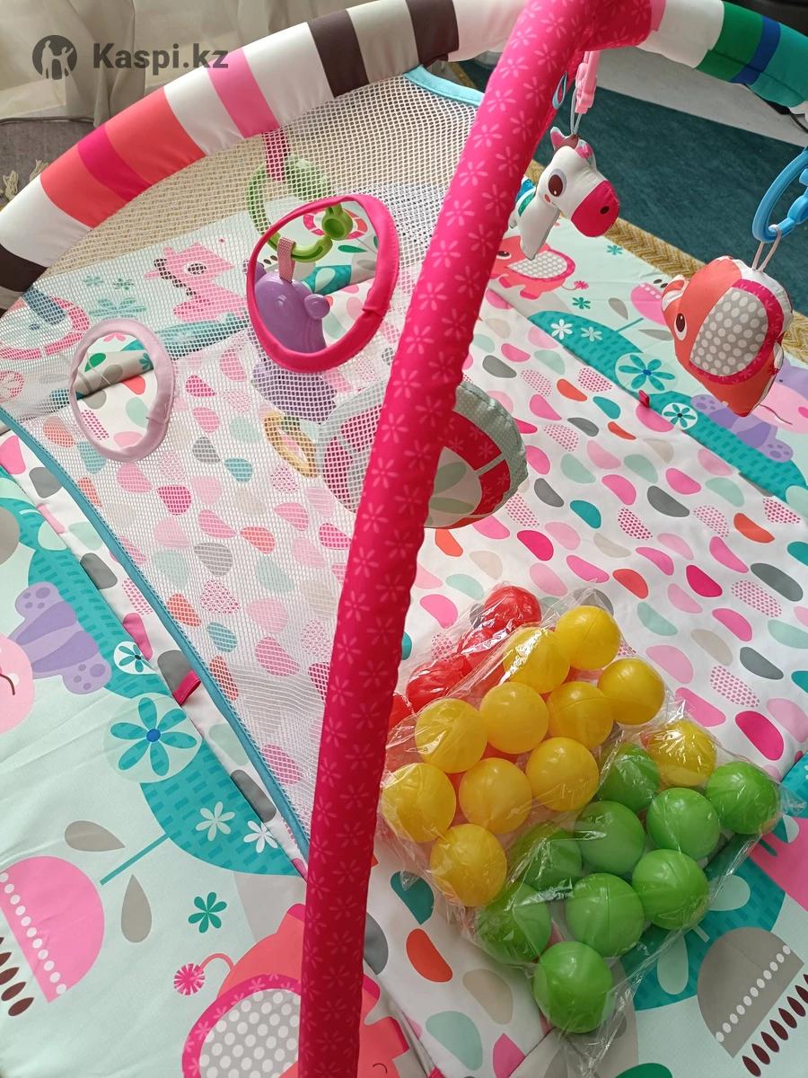 Развивающий коврик с яркими картинками и игрушками животных. В использовании был 3 месяца (с 3х до 6 месяцев), пока ребенок не сел и не пополз, в основном лежали в нем. В розовой цветовой гамме. Коврик можно использовать в 5 вариантах. Бортики складываются. Можно использовать как с дугами, так и без них. Весь текстиль постиран, упакован в коробку. Не хватает только 1 шарика. Размер: 11010050